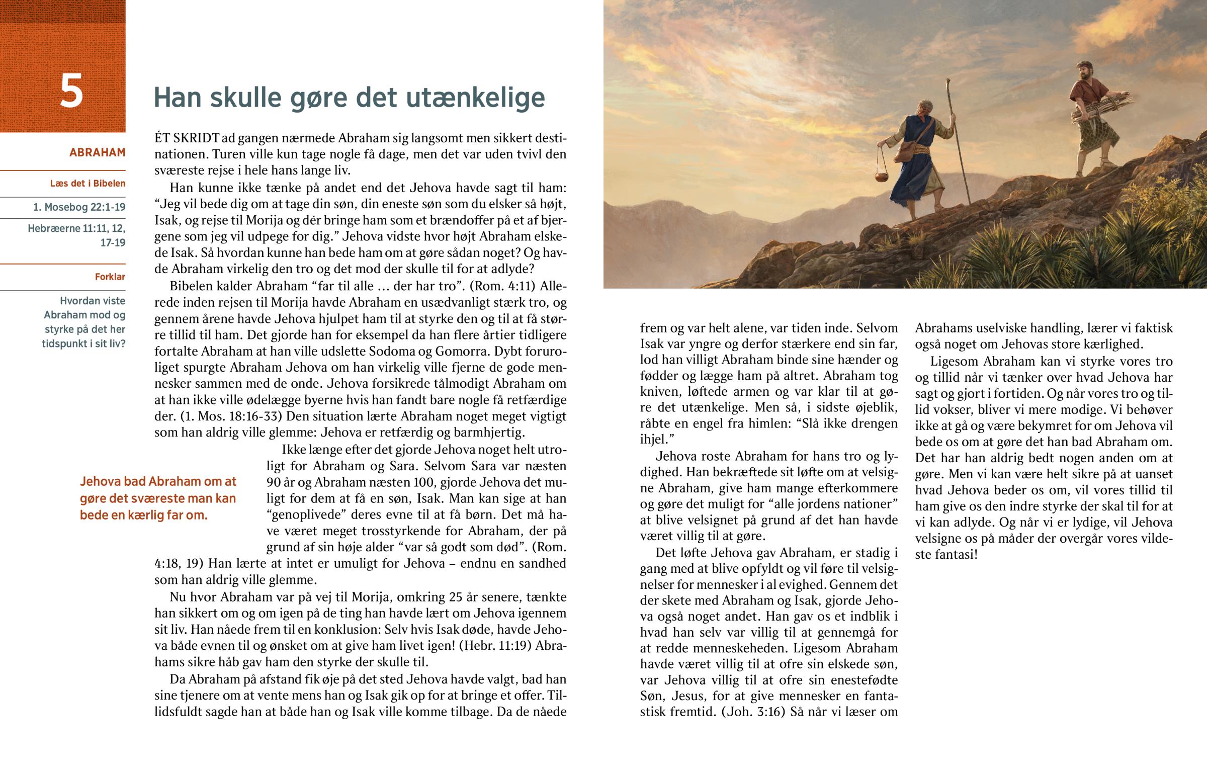Han kunne ikke tænke på andet end det Jehova havde sagt til ham: “Jeg vil bede dig om at tage din søn, din eneste søn som du elsker så højt, Isak, og rejse til Morija og dér bringe ham som et brændoffer på et af bjergene som jeg vil udpege for dig.” Jehova vidste hvor højt Abraham elskede Isak. Så hvordan kunne han bede ham om at gøre sådan noget? Og havde Abraham virkelig den tro og det mod der skulle til for at adlyde?