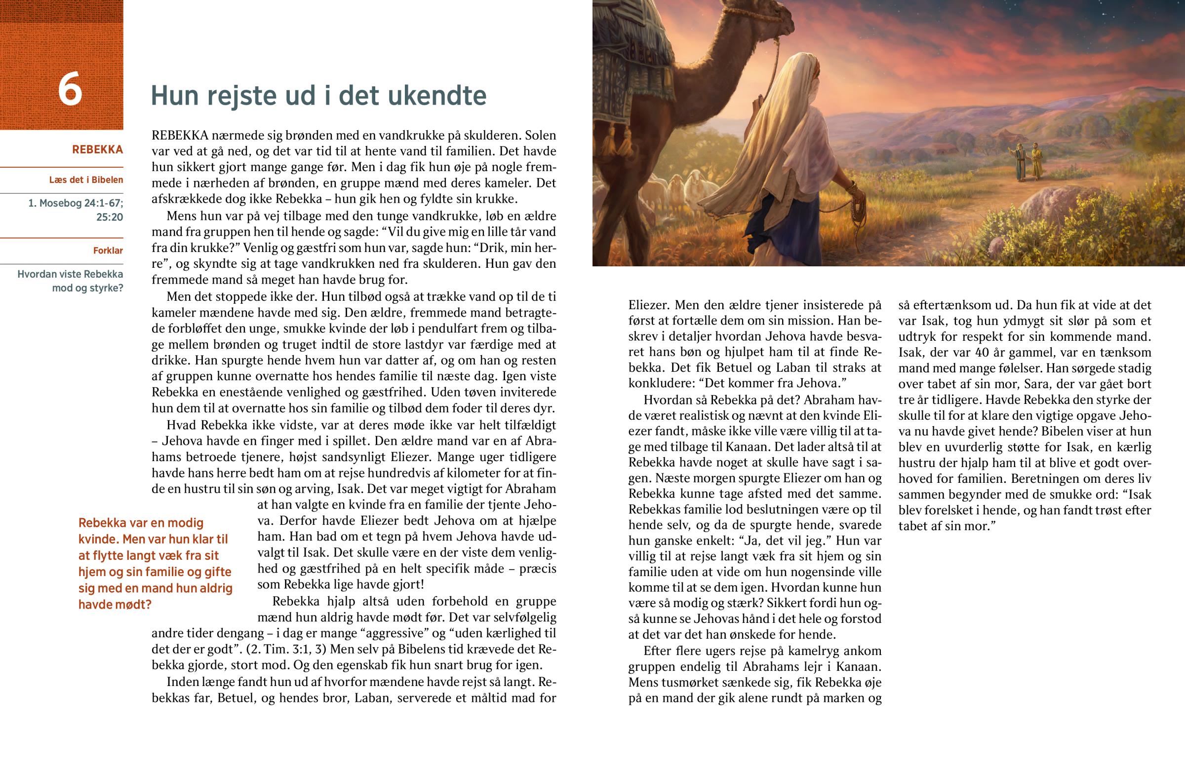 Rebekka hjalp altså uden forbehold en gruppe mænd hun aldrig havde mødt før. Det var selvfølgelig andre tider dengang – i dag er mange “aggressive” og “uden kærlighed til det der er godt”. (2. Tim. 3:1, 3) Men selv på Bibelens tid krævede det Rebekka gjorde, stort mod. Og den egenskab fik hun snart brug for igen.