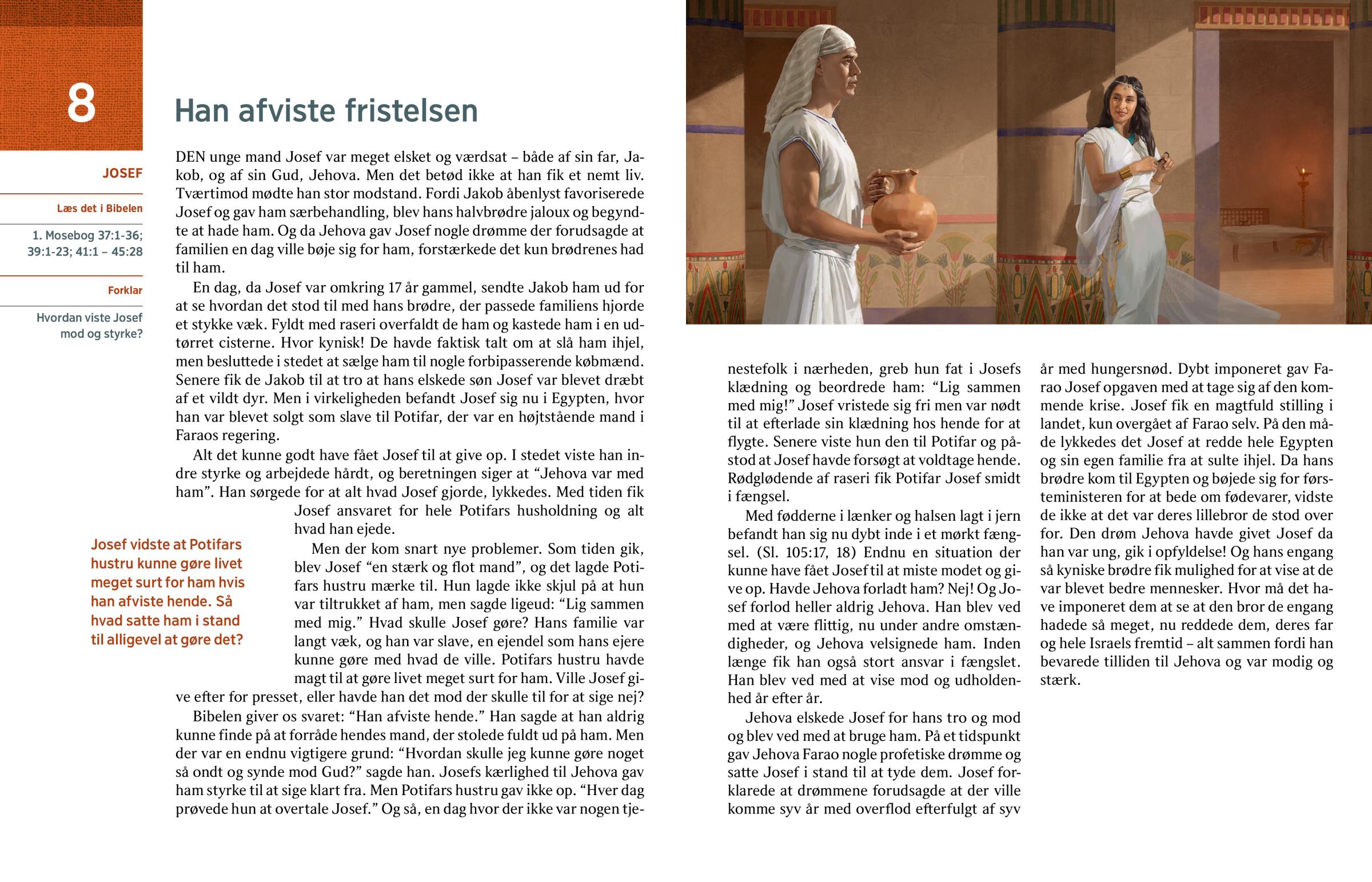 Men der kom snart nye problemer. Som tiden gik, blev Josef “en stærk og flot mand”, og det lagde Potifars hustru mærke til. Hun lagde ikke skjul på at hun var tiltrukket af ham, men sagde ligeud: “Lig sammen med mig.” Hvad skulle Josef gøre? Hans familie var langt væk, og han var slave, en ejendel som hans ejere kunne gøre med hvad de ville. Potifars hustru havde magt til at gøre livet meget surt for ham. Ville Josef give efter for presset, eller havde han det mod der skulle til for at sige nej?
