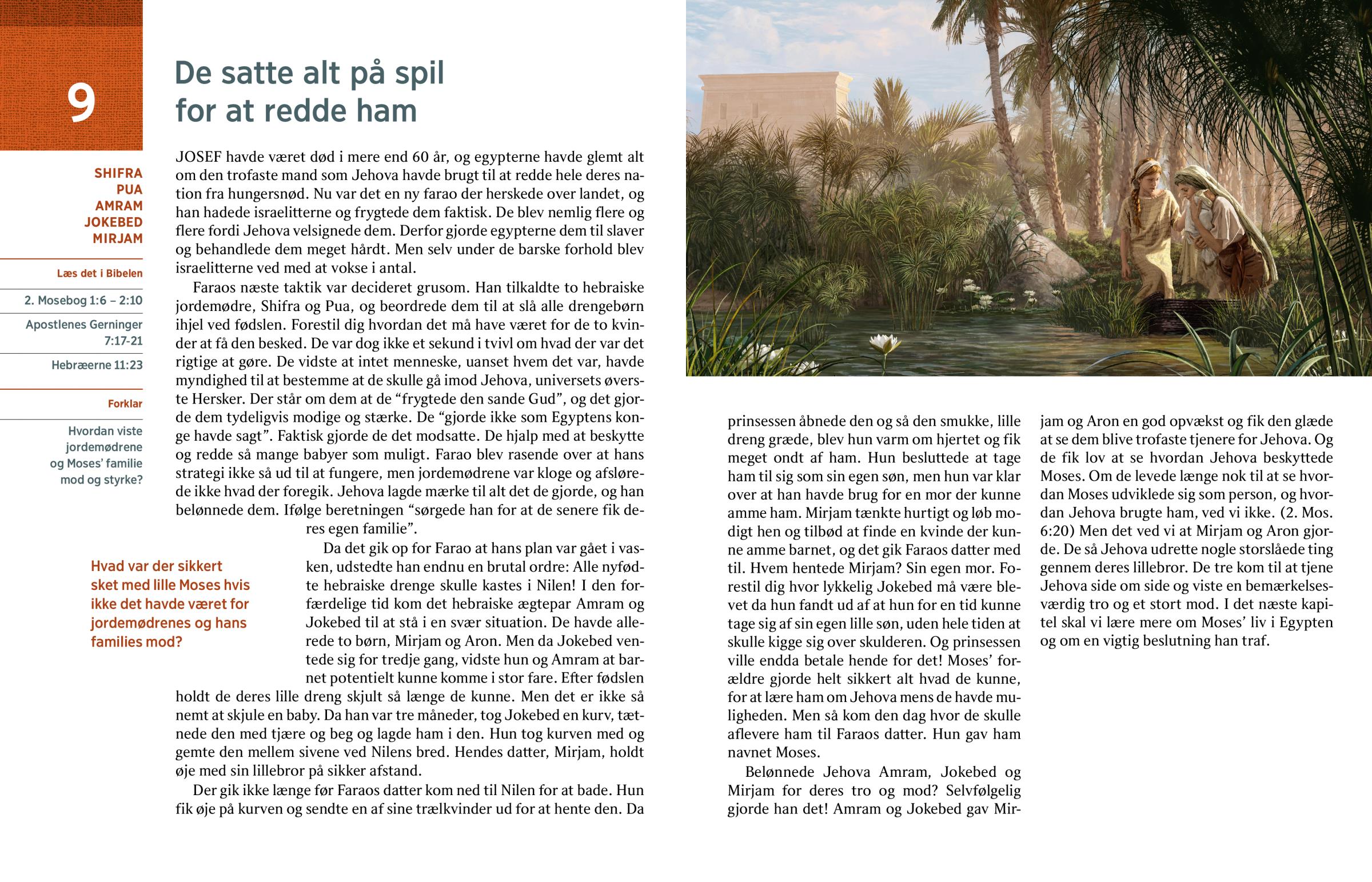 Der gik ikke længe før Faraos datter kom ned til Nilen for at bade. Hun fik øje på kurven og sendte en af sine trælkvinder ud for at hente den. Da prinsessen åbnede den og så den smukke, lille dreng græde, blev hun varm om hjertet og fik meget ondt af ham. Hun besluttede at tage ham til sig som sin egen søn, men hun var klar over at han havde brug for en mor der kunne amme ham. Mirjam tænkte hurtigt og løb modigt hen og tilbød at finde en kvinde der kunne amme barnet, og det gik Faraos datter med til. Hvem hentede Mirjam? Sin egen mor. Forestil dig hvor lykkelig Jokebed må være blevet da hun fandt ud af at hun for en tid kunne tage sig af sin egen lille søn, uden hele tiden at skulle kigge sig over skulderen. Og prinsessen ville endda betale hende for det! Moses’ forældre gjorde helt sikkert alt hvad de kunne, for at lære ham om Jehova mens de havde muligheden. Men så kom den dag hvor de skulle aflevere ham til Faraos datter. Hun gav ham navnet Moses.