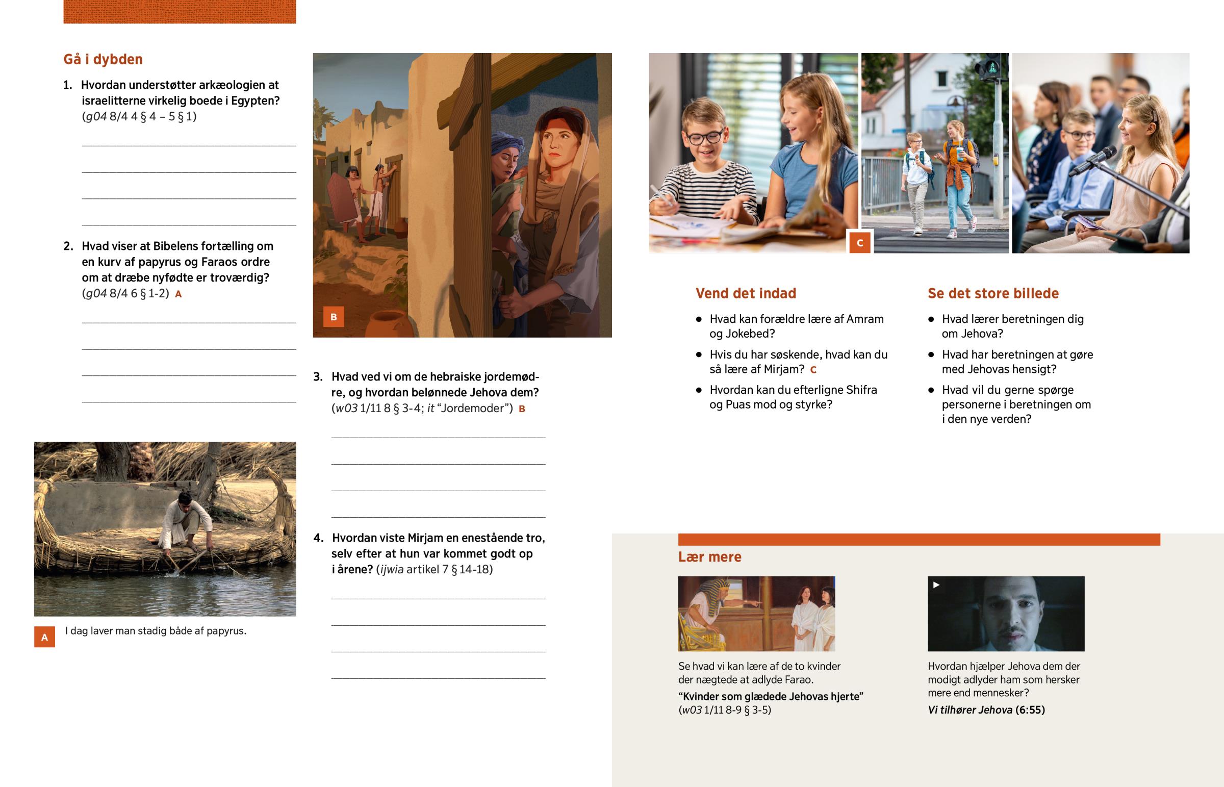 Belønnede Jehova Amram, Jokebed og Mirjam for deres tro og mod? Selvfølgelig gjorde han det! Amram og Jokebed gav Mirjam og Aron en god opvækst og fik den glæde at se dem blive trofaste tjenere for Jehova. Og de fik lov at se hvordan Jehova beskyttede Moses. Om de levede længe nok til at se hvordan Moses udviklede sig som person, og hvordan Jehova brugte ham, ved vi ikke. (2. Mos. 6:20) Men det ved vi at Mirjam og Aron gjorde. De så Jehova udrette nogle storslåede ting gennem deres lillebror. De tre kom til at tjene Jehova side om side og viste en bemærkelsesværdig tro og et stort mod. I det næste kapitel skal vi lære mere om Moses’ liv i Egypten og om en vigtig beslutning han traf.
