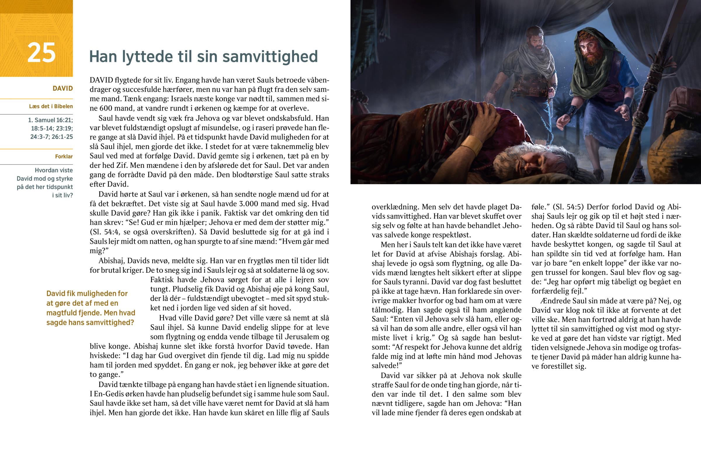 Hvad ville David gøre? Det ville være så nemt at slå Saul ihjel. Så kunne David endelig slippe for at leve som flygtning og endda vende tilbage til Jerusalem og blive konge. Abishaj kunne slet ikke forstå hvorfor David tøvede. Han hviskede: “I dag har Gud overgivet din fjende til dig. Lad mig nu spidde ham til jorden med spyddet. Én gang er nok, jeg behøver ikke at gøre det to gange.”