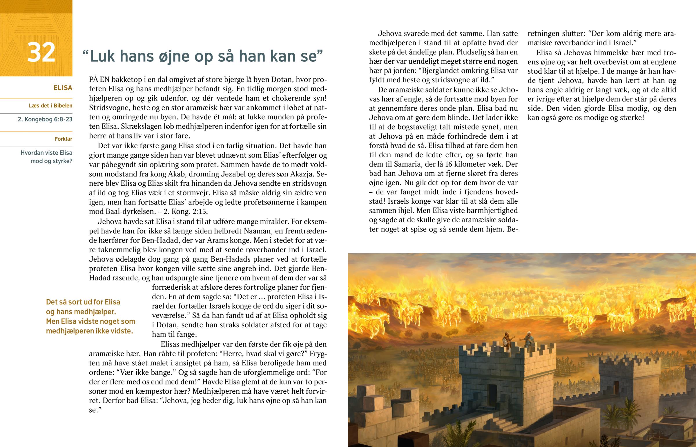 Elisa så Jehovas himmelske hær med troens øjne og var helt overbevist om at englene stod klar til at hjælpe. I de mange år han havde tjent Jehova, havde han lært at han og hans engle aldrig er langt væk, og at de altid er ivrige efter at hjælpe dem der står på deres side. Den viden gjorde Elisa modig, og den kan også gøre os modige og stærke!