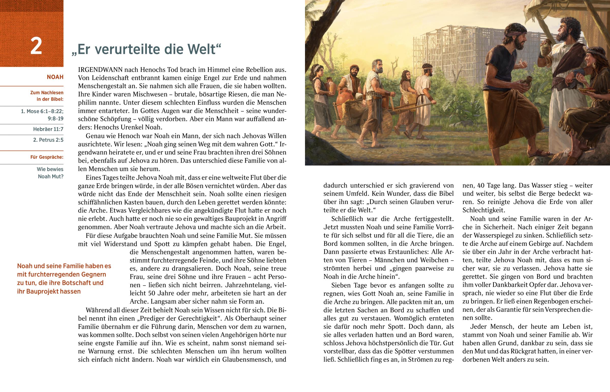 Eines Tages teilte Jehova Noah mit, dass er eine weltweite Flut über die ganze Erde bringen würde, in der alle Bösen vernichtet würden. Aber das würde nicht das Ende der Menschheit sein. Noah sollte einen riesigen schiffähnlichen Kasten bauen, durch den Leben gerettet werden könnte: die Arche. Etwas Vergleichbares wie die angekündigte Flut hatte er noch nie erlebt. Auch hatte er noch nie so ein gewaltiges Bauprojekt in Angriff genommen. Aber Noah vertraute Jehova und machte sich an die Arbeit.
