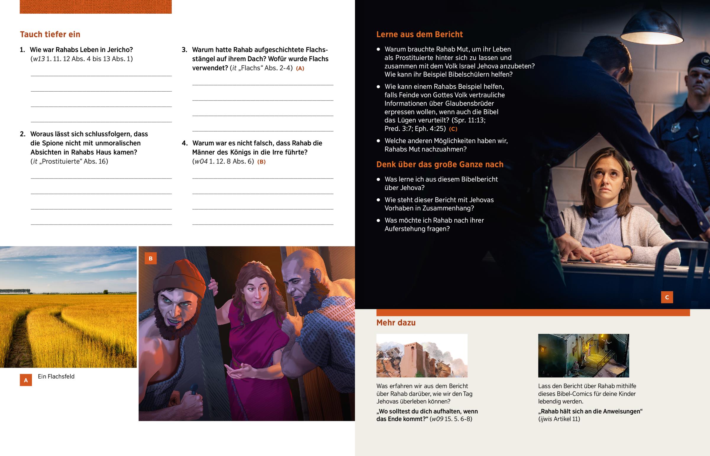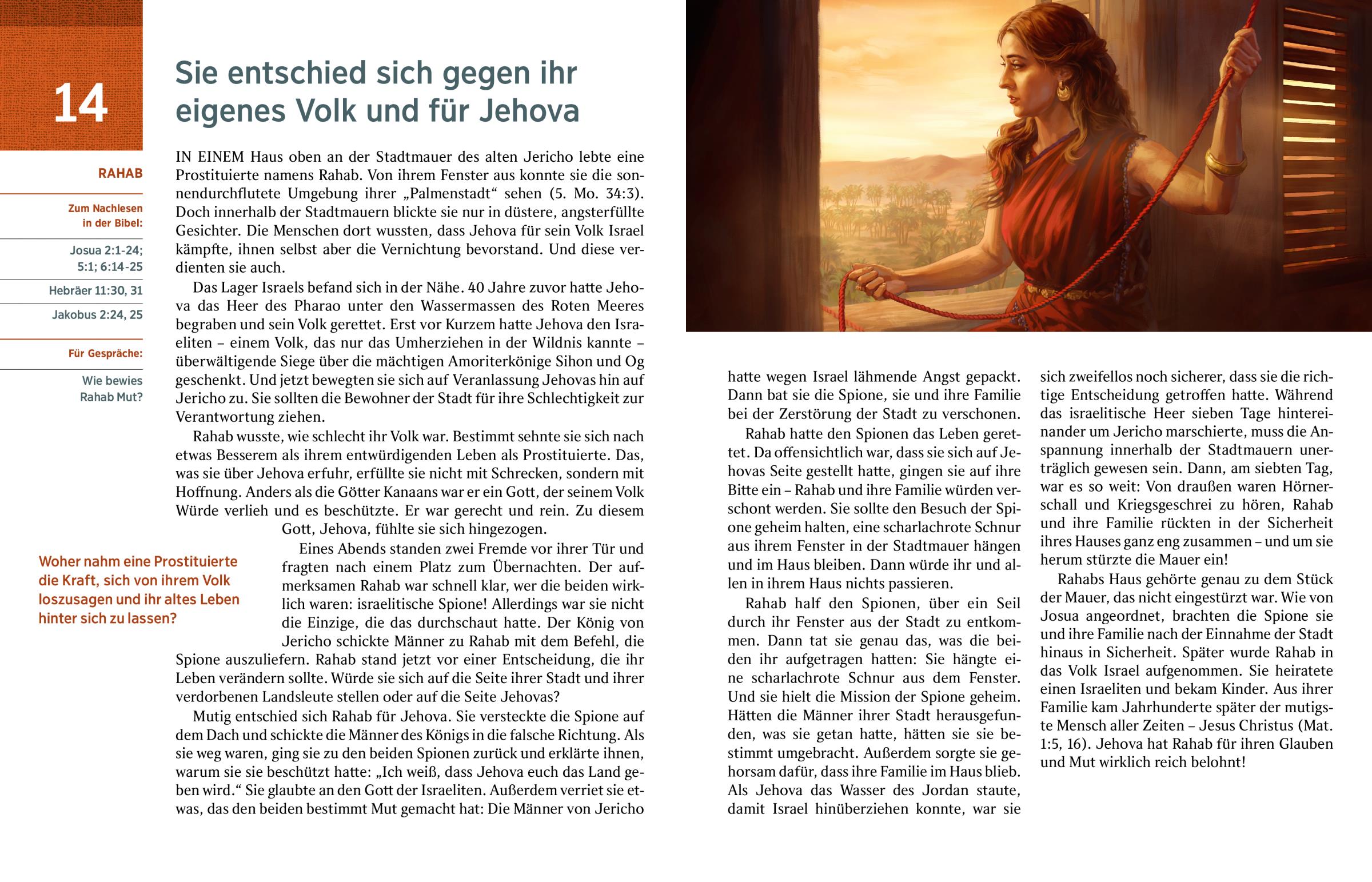 Eines Abends standen zwei Fremde vor ihrer Tür und fragten nach einem Platz zum Übernachten. Der aufmerksamen Rahab war schnell klar, wer die beiden wirklich waren: israelitische Spione! Allerdings war sie nicht die Einzige, die das durchschaut hatte. Der König von Jericho schickte Männer zu Rahab mit dem Befehl, die Spione auszuliefern. Rahab stand jetzt vor einer Entscheidung, die ihr Leben verändern sollte. Würde sie sich auf die Seite ihrer Stadt und ihrer verdorbenen Landsleute stellen oder auf die Seite Jehovas?