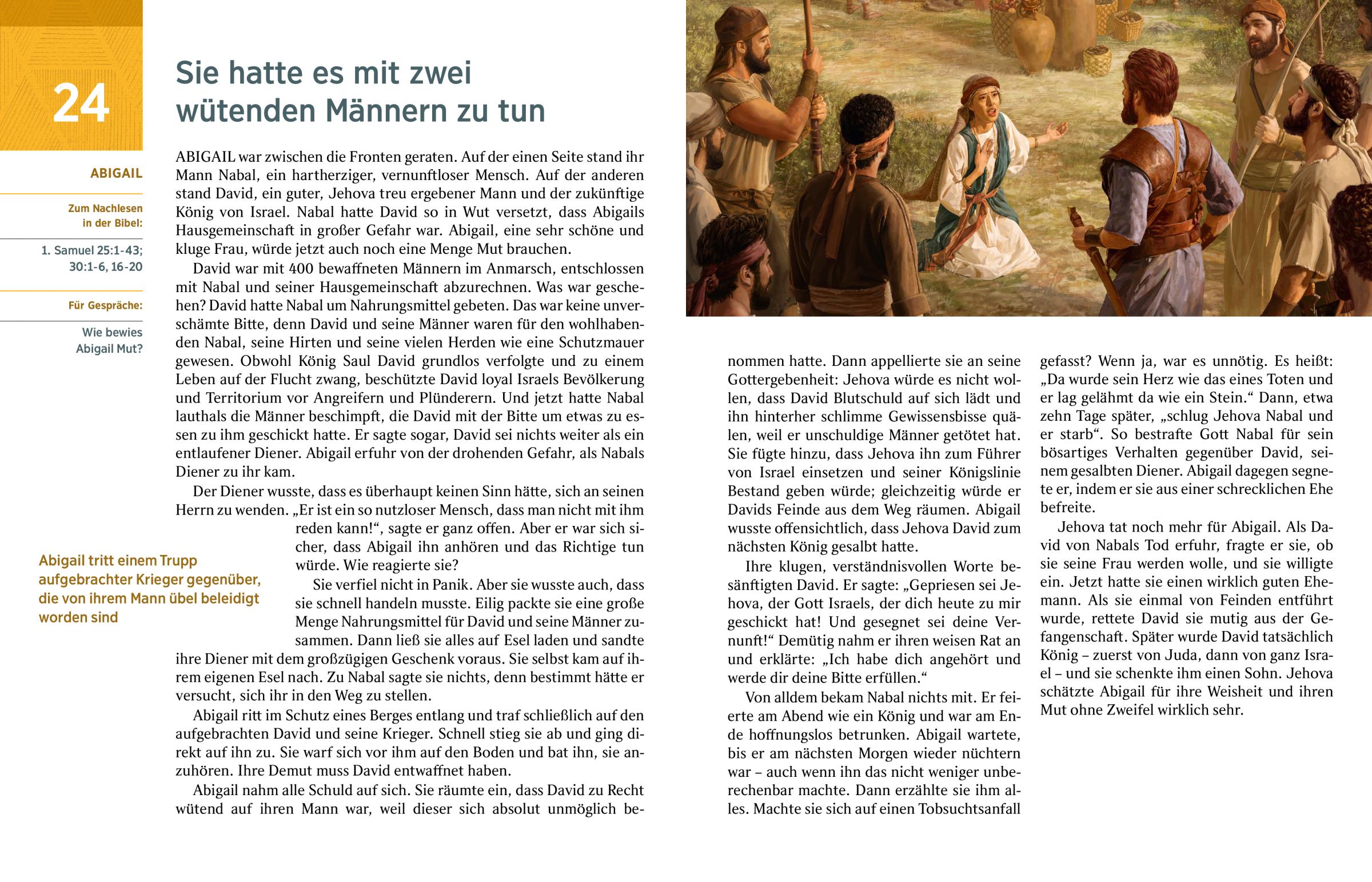 ABIGAIL war zwischen die Fronten geraten. Auf der einen Seite stand ihr Mann Nabal, ein hartherziger, vernunftloser Mensch. Auf der anderen stand David, ein guter, Jehova treu ergebener Mann und der zukünftige König von Israel. Nabal hatte David so in Wut versetzt, dass Abigails Hausgemeinschaft in großer Gefahr war. Abigail, eine sehr schöne und kluge Frau, würde jetzt auch noch eine Menge Mut brauchen.