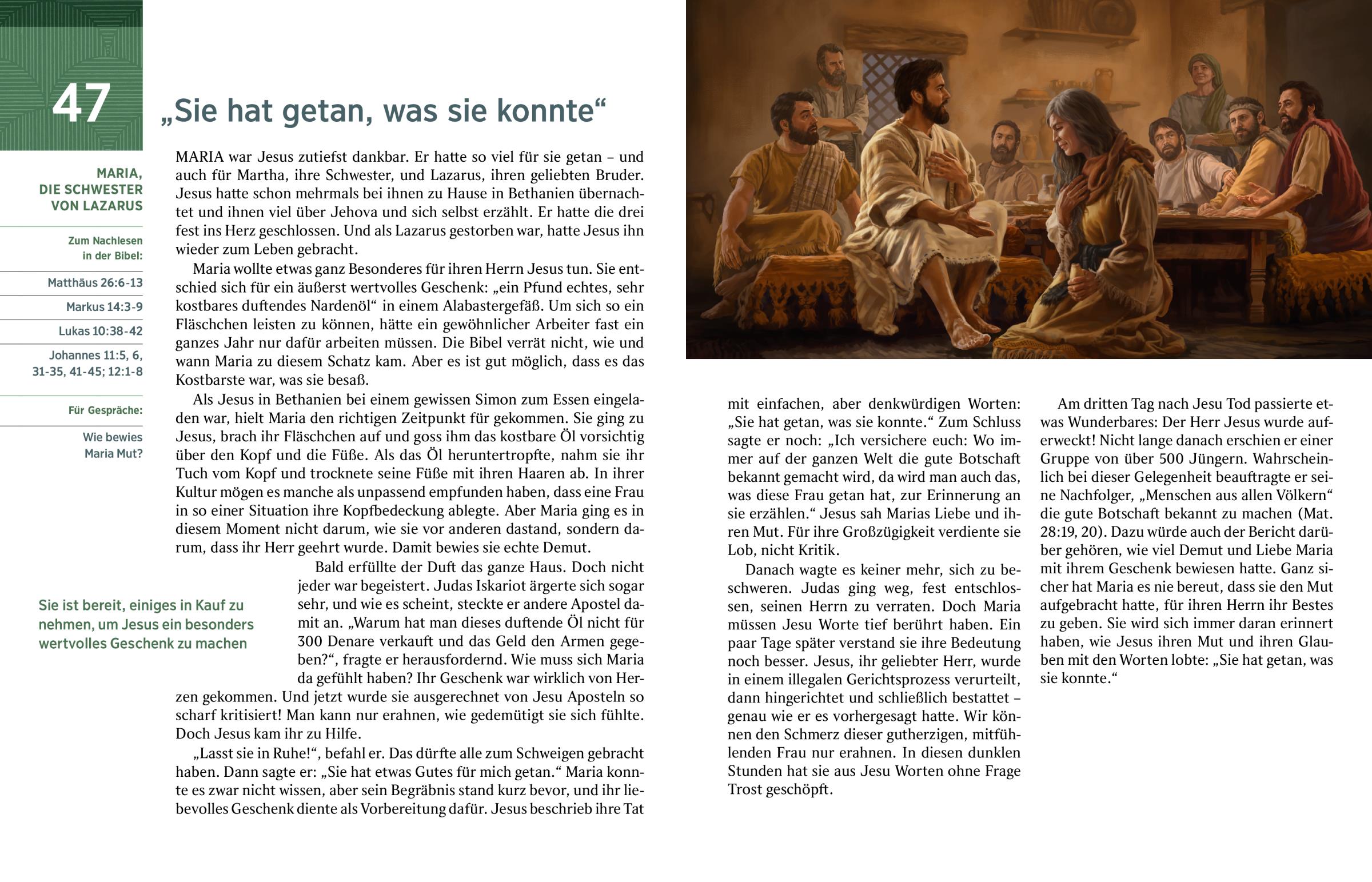 Am dritten Tag nach Jesu Tod passierte etwas Wunderbares: Der Herr Jesus wurde auferweckt! Nicht lange danach erschien er einer Gruppe von über 500 Jüngern. Wahrscheinlich bei dieser Gelegenheit beauftragte er seine Nachfolger, „Menschen aus allen Völkern“ die gute Botschaft bekannt zu machen (Mat. 28:19, 20). Dazu würde auch der Bericht darüber gehören, wie viel Demut und Liebe Maria mit ihrem Geschenk bewiesen hatte. Ganz sicher hat Maria es nie bereut, dass sie den Mut aufgebracht hatte, für ihren Herrn ihr Bestes zu geben. Sie wird sich immer daran erinnert haben, wie Jesus ihren Mut und ihren Glauben mit den Worten lobte: „Sie hat getan, was sie konnte.“