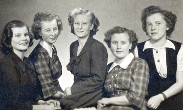Qaane la götrane mi: Eeva Kallio, Saimi Mattila-Syrjälä, Aili, Annikki, me Saara Noponen lo macatre 1949