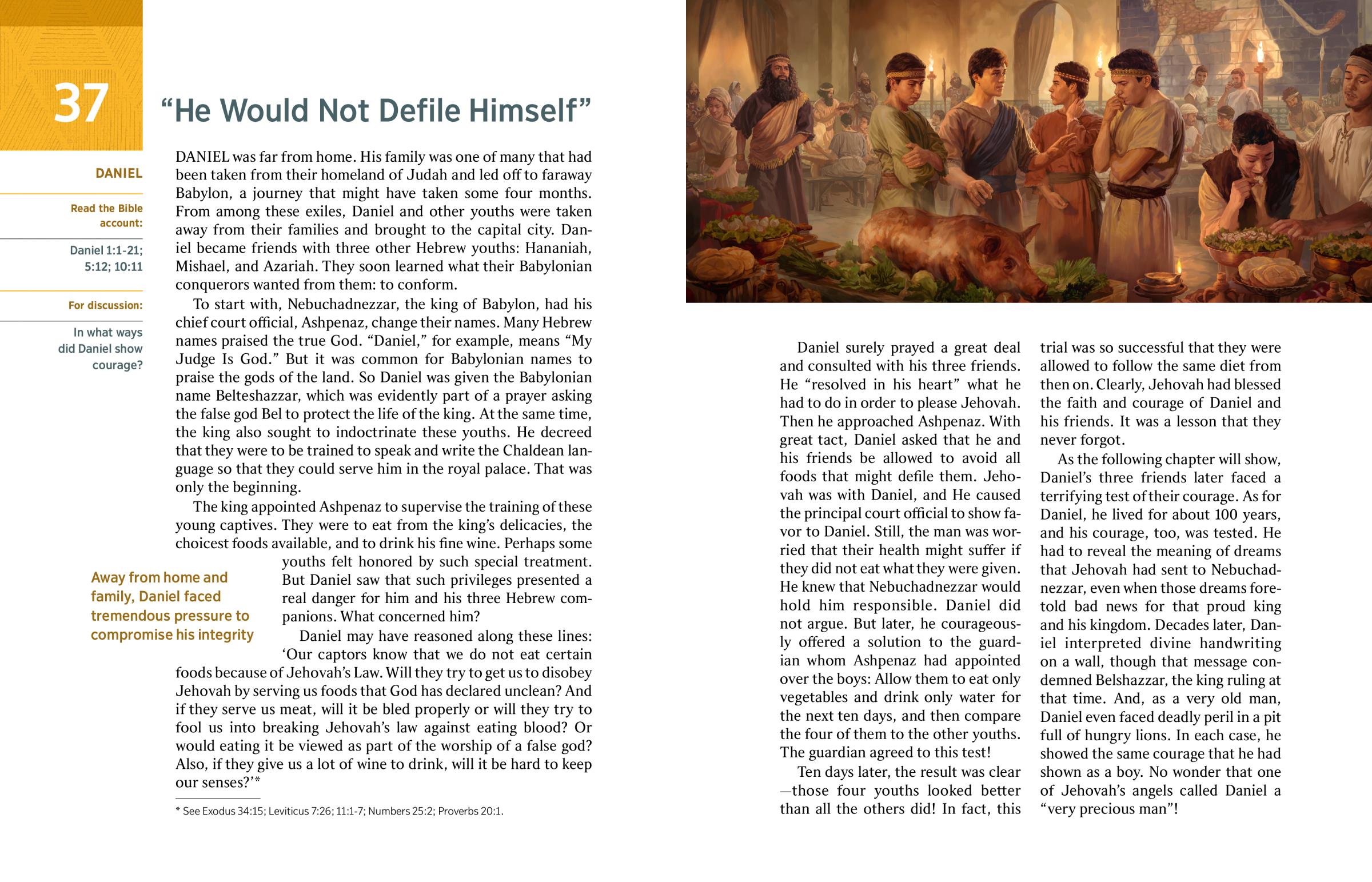 Daniel may have reasoned along these lines: ‘Our captors know that we do not eat certain foods because of Jehovah’s Law. Will they try to get us to disobey Jehovah by serving us foods that God has declared unclean? And if they serve us meat, will it be bled properly or will they try to fool us into breaking Jehovah’s law against eating blood? Or would eating it be viewed as part of the worship of a false god? Also, if they give us a lot of wine to drink, will it be hard to keep our senses?’a
