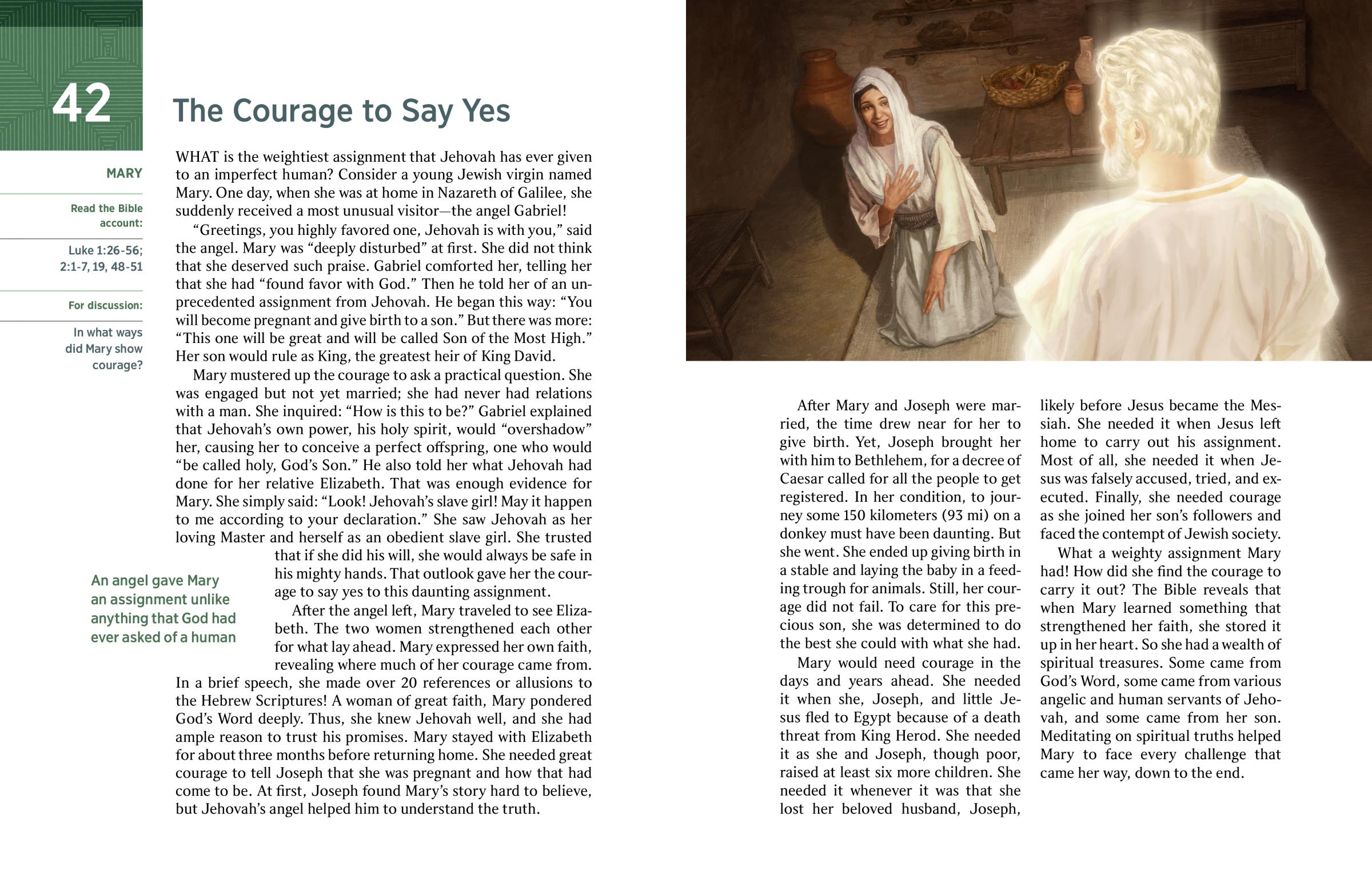 What a weighty assignment Mary had! How did she find the courage to carry it out? The Bible reveals that when Mary learned something that strengthened her faith, she stored it up in her heart. So she had a wealth of spiritual treasures. Some came from God’s Word, some came from various angelic and human servants of Jehovah, and some came from her son. Meditating on spiritual truths helped Mary to face every challenge that came her way, down to the end.
