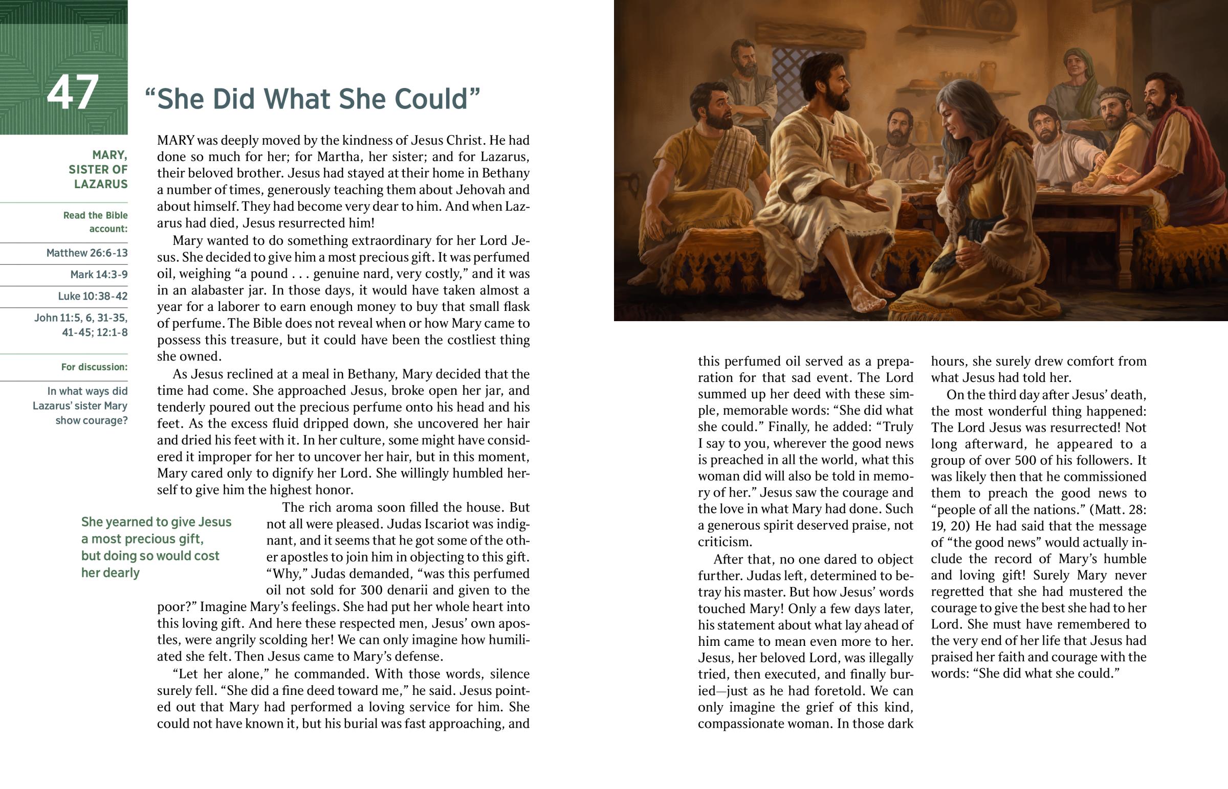 On the third day after Jesus’ death, the most wonderful thing happened: The Lord Jesus was resurrected! Not long afterward, he appeared to a group of over 500 of his followers. It was likely then that he commissioned them to preach the good news to “people of all the nations.” (Matt. 28:19, 20) He had said that the message of “the good news” would actually include the record of Mary’s humble and loving gift! Surely Mary never regretted that she had mustered the courage to give the best she had to her Lord. She must have remembered to the very end of her life that Jesus had praised her faith and courage with the words: “She did what she could.”