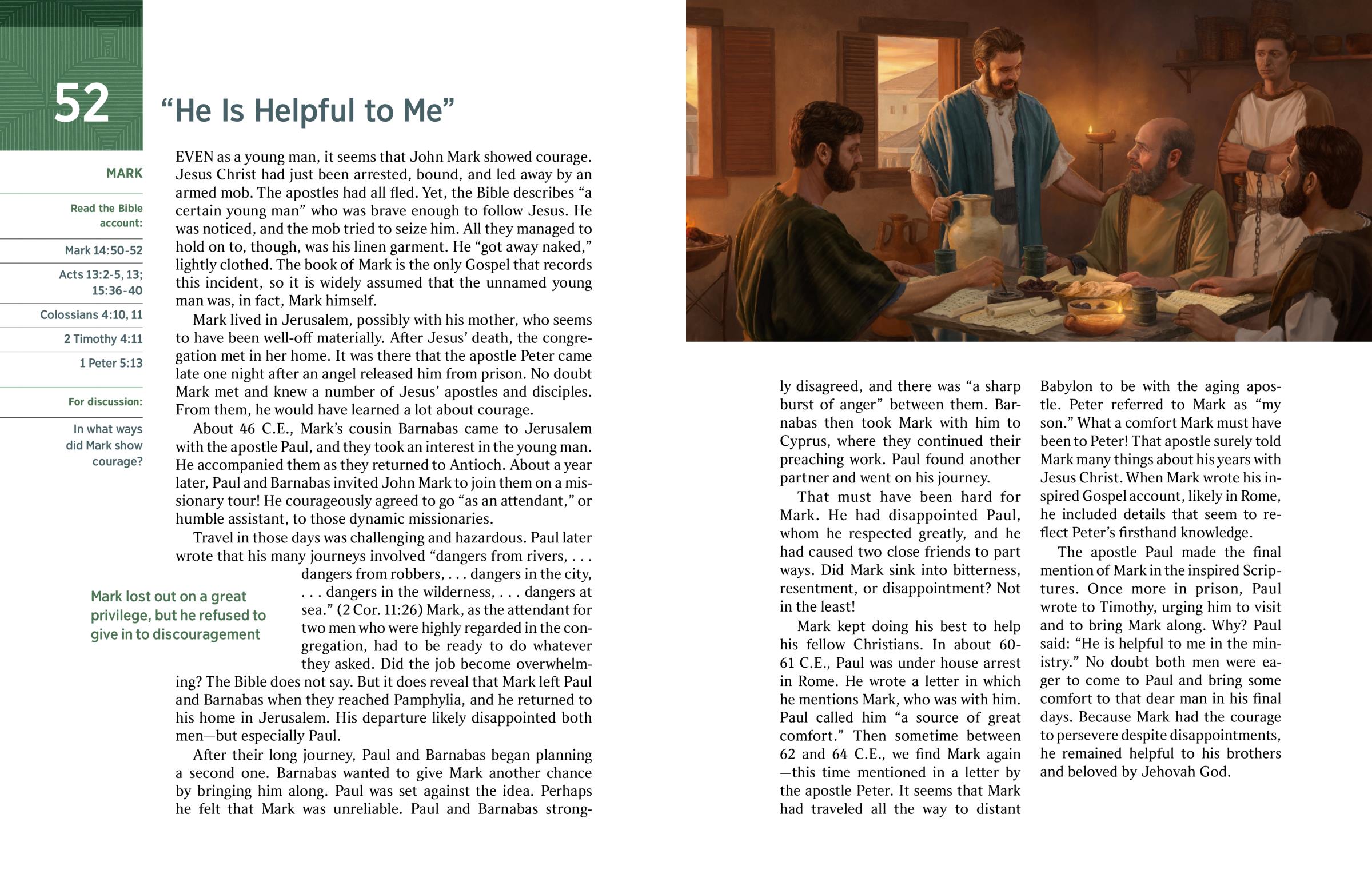 Mark kept doing his best to help his fellow Christians. In about 60-61 C.E., Paul was under house arrest in Rome. He wrote a letter in which he mentions Mark, who was with him. Paul called him “a source of great comfort.” Then sometime between 62 and 64 C.E., we find Mark again​—this time mentioned in a letter by the apostle Peter. It seems that Mark had traveled all the way to distant Babylon to be with the aging apostle. Peter referred to Mark as “my son.” What a comfort Mark must have been to Peter! That apostle surely told Mark many things about his years with Jesus Christ. When Mark wrote his inspired Gospel account, likely in Rome, he included details that seem to reflect Peter’s firsthand knowledge.