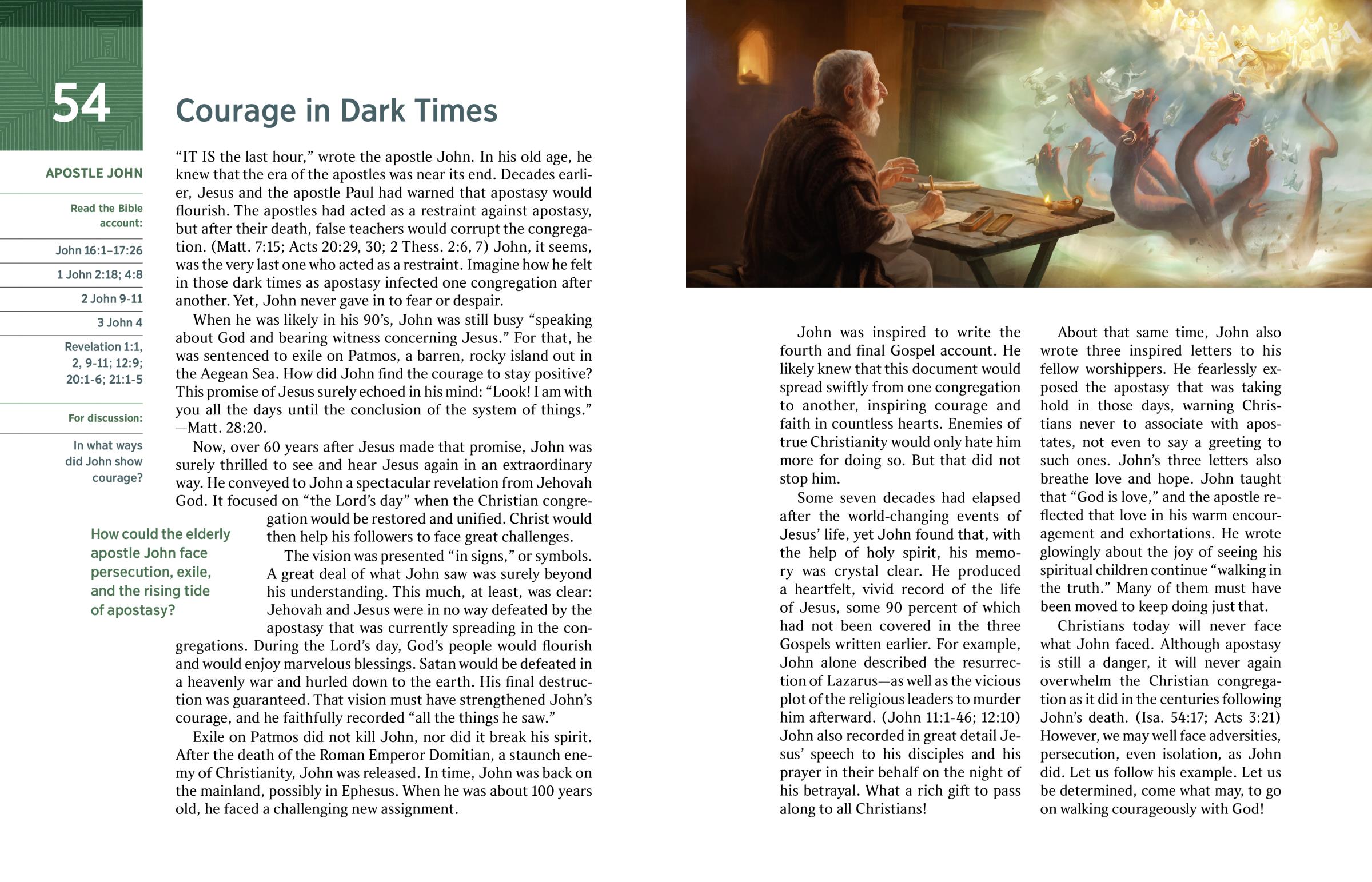 Christians today will never face what John faced. Although apostasy is still a danger, it will never again overwhelm the Christian congregation as it did in the centuries following John’s death. (Isa. 54:17; Acts 3:21) However, we may well face adversities, persecution, even isolation, as John did. Let us follow his example. Let us be determined, come what may, to go on walking courageously with God!