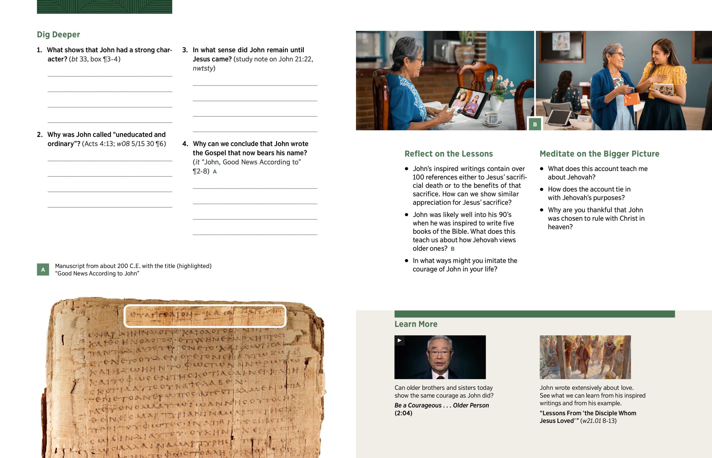 John was likely well into his 90’s when he was inspired to write five books of the Bible. What does this teach us about how Jehovah views older ones? B