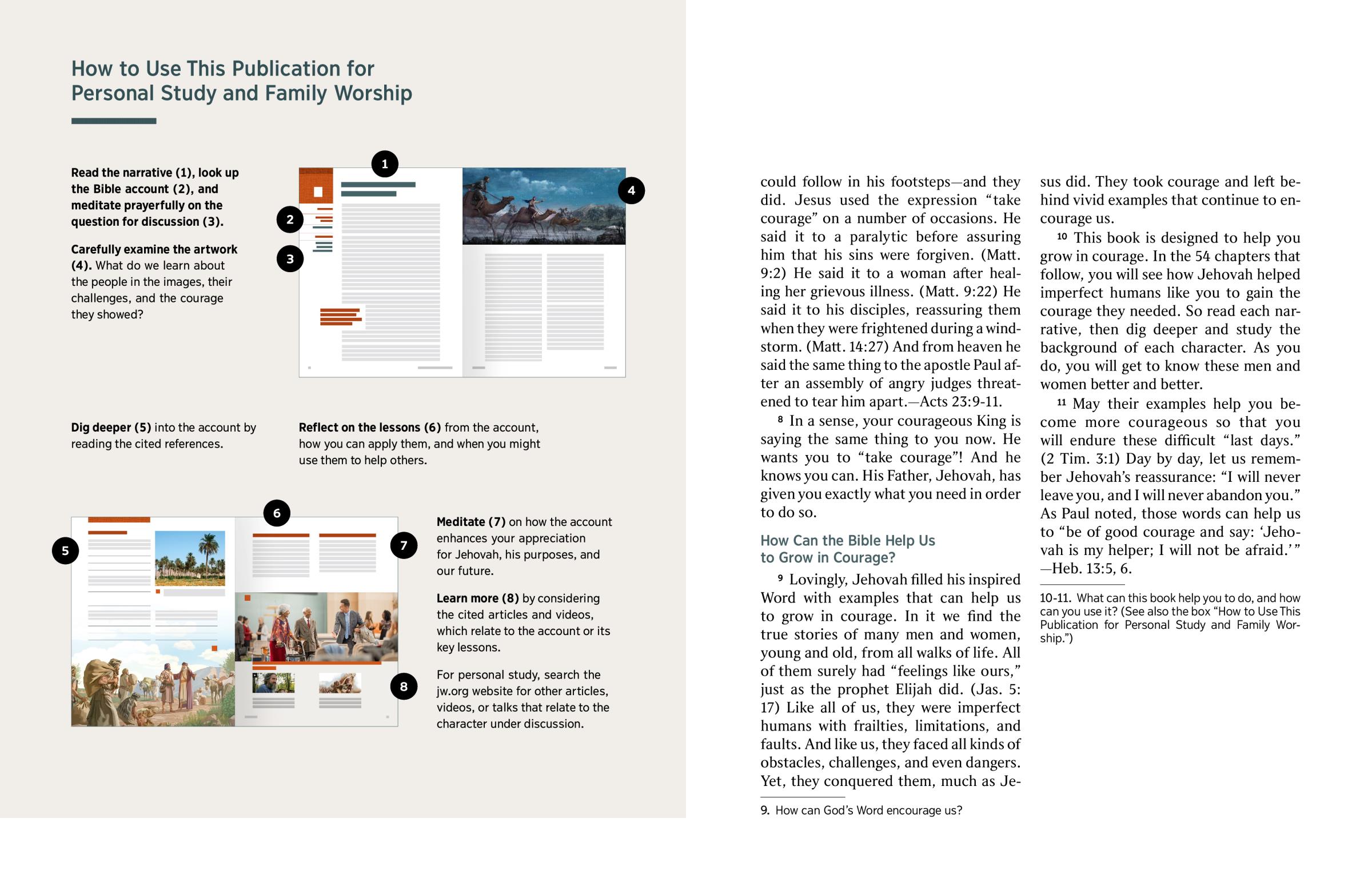 10 This book is designed to help you grow in courage. In the 54 chapters that follow, you will see how Jehovah helped imperfect humans like you to gain the courage they needed. So read each narrative, then dig deeper and study the background of each character. As you do, you will get to know these men and women better and better.