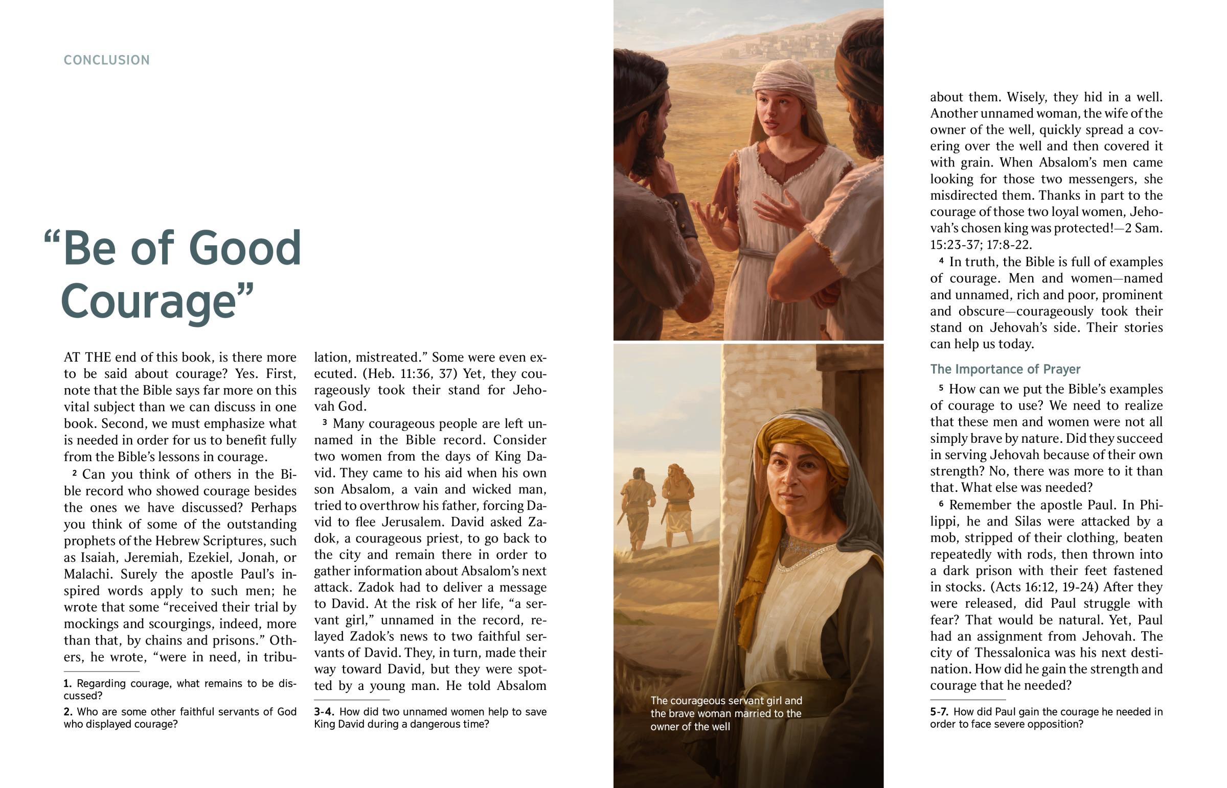 3 Many courageous people are left unnamed in the Bible record. Consider two women from the days of King David. They came to his aid when his own son Absalom, a vain and wicked man, tried to overthrow his father, forcing David to flee Jerusalem. David asked Zadok, a courageous priest, to go back to the city and remain there in order to gather information about Absalom’s next attack. Zadok had to deliver a message to David. At the risk of her life, “a servant girl,” unnamed in the record, relayed Zadok’s news to two faithful servants of David. They, in turn, made their way toward David, but they were spotted by a young man. He told Absalom about them. Wisely, they hid in a well. Another unnamed woman, the wife of the owner of the well, quickly spread a covering over the well and then covered it with grain. When Absalom’s men came looking for those two messengers, she misdirected them. Thanks in part to the courage of those two loyal women, Jehovah’s chosen king was protected!—2 Sam. 15:23-37; 17:8-22.