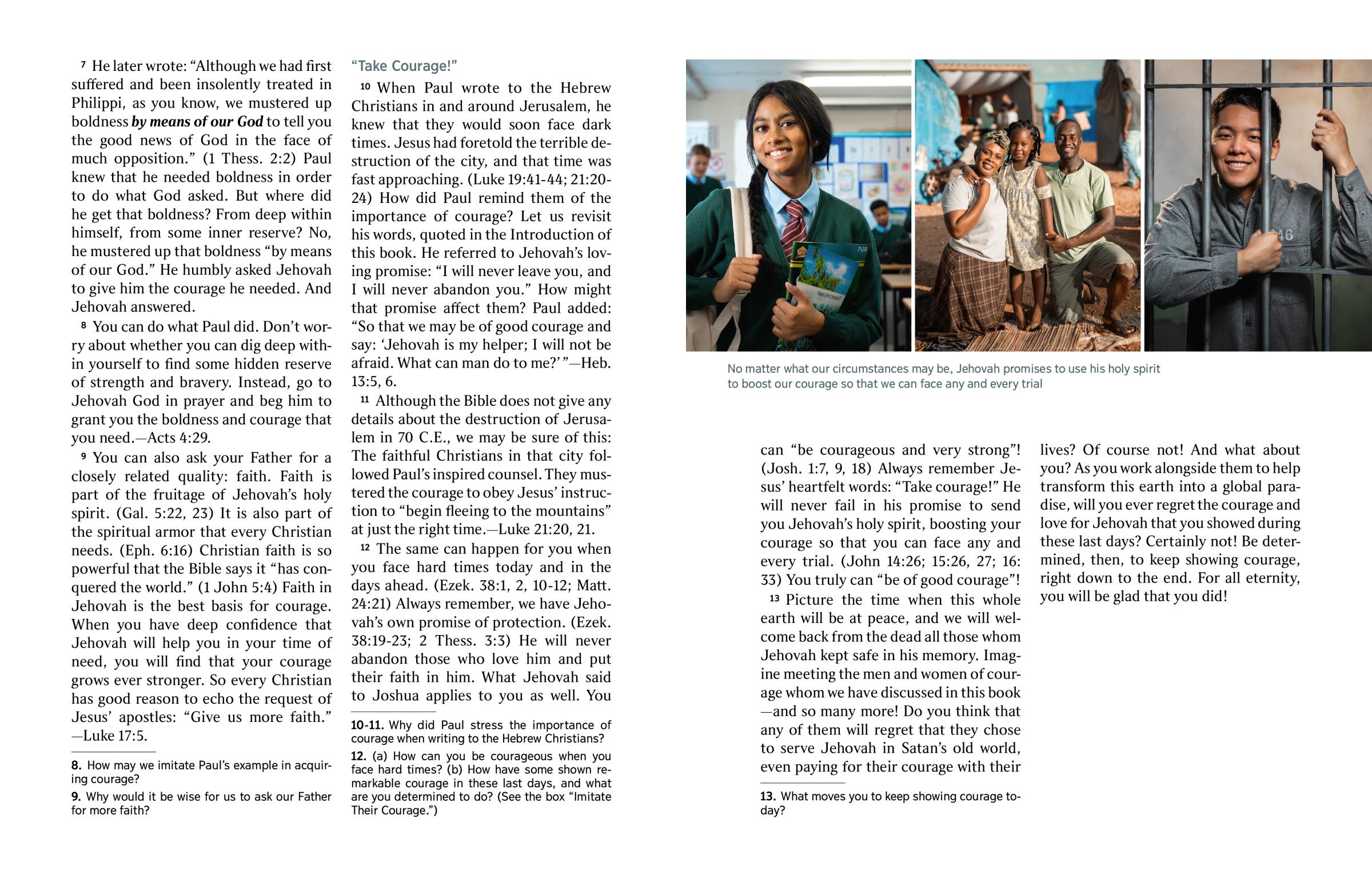 10 When Paul wrote to the Hebrew Christians in and around Jerusalem, he knew that they would soon face dark times. Jesus had foretold the terrible destruction of the city, and that time was fast approaching. (Luke 19:41-44; 21:20-24) How did Paul remind them of the importance of courage? Let us revisit his words, quoted in the Introduction of this book. He referred to Jehovah’s loving promise: “I will never leave you, and I will never abandon you.” How might that promise affect them? Paul added: “So that we may be of good courage and say: ‘Jehovah is my helper; I will not be afraid. What can man do to me?’”—Heb. 13:5, 6.