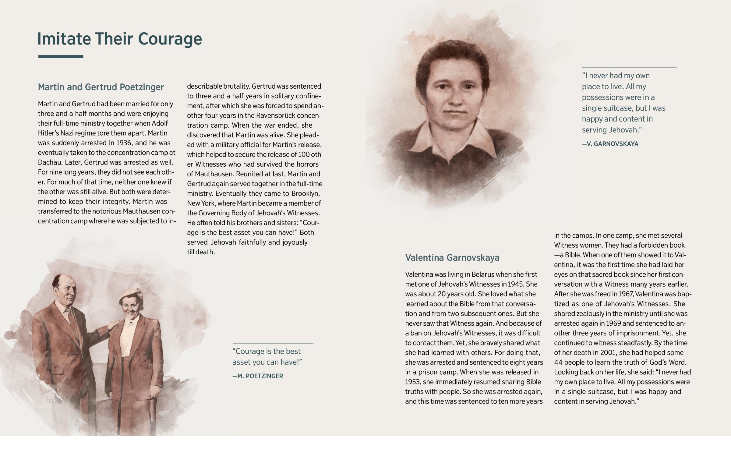 13 Picture the time when this whole earth will be at peace, and we will welcome back from the dead all those whom Jehovah kept safe in his memory. Imagine meeting the men and women of courage whom we have discussed in this book—and so many more! Do you think that any of them will regret that they chose to serve Jehovah in Satan’s old world, even paying for their courage with their lives? Of course not! And what about you? As you work alongside them to help transform this earth into a global paradise, will you ever regret the courage and love for Jehovah that you showed during these last days? Certainly not! Be determined, then, to keep showing courage, right down to the end. For all eternity, you will be glad that you did!
