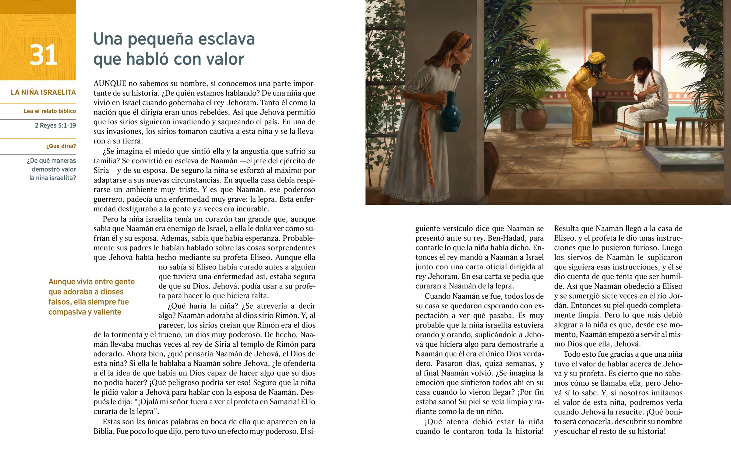 ¡Qué atenta debió estar la niña cuando le contaron toda la historia! Resulta que Naamán llegó a la casa de Eliseo, y el profeta le dio unas instrucciones que lo pusieron furioso. Luego los siervos de Naamán le suplicaron que siguiera esas instrucciones, y él se dio cuenta de que tenía que ser humilde. Así que Naamán obedeció a Eliseo y se sumergió siete veces en el río Jordán. Entonces su piel quedó completamente limpia. Pero lo que más debió alegrar a la niña es que, desde ese momento, Naamán empezó a servir al mismo Dios que ella, Jehová.