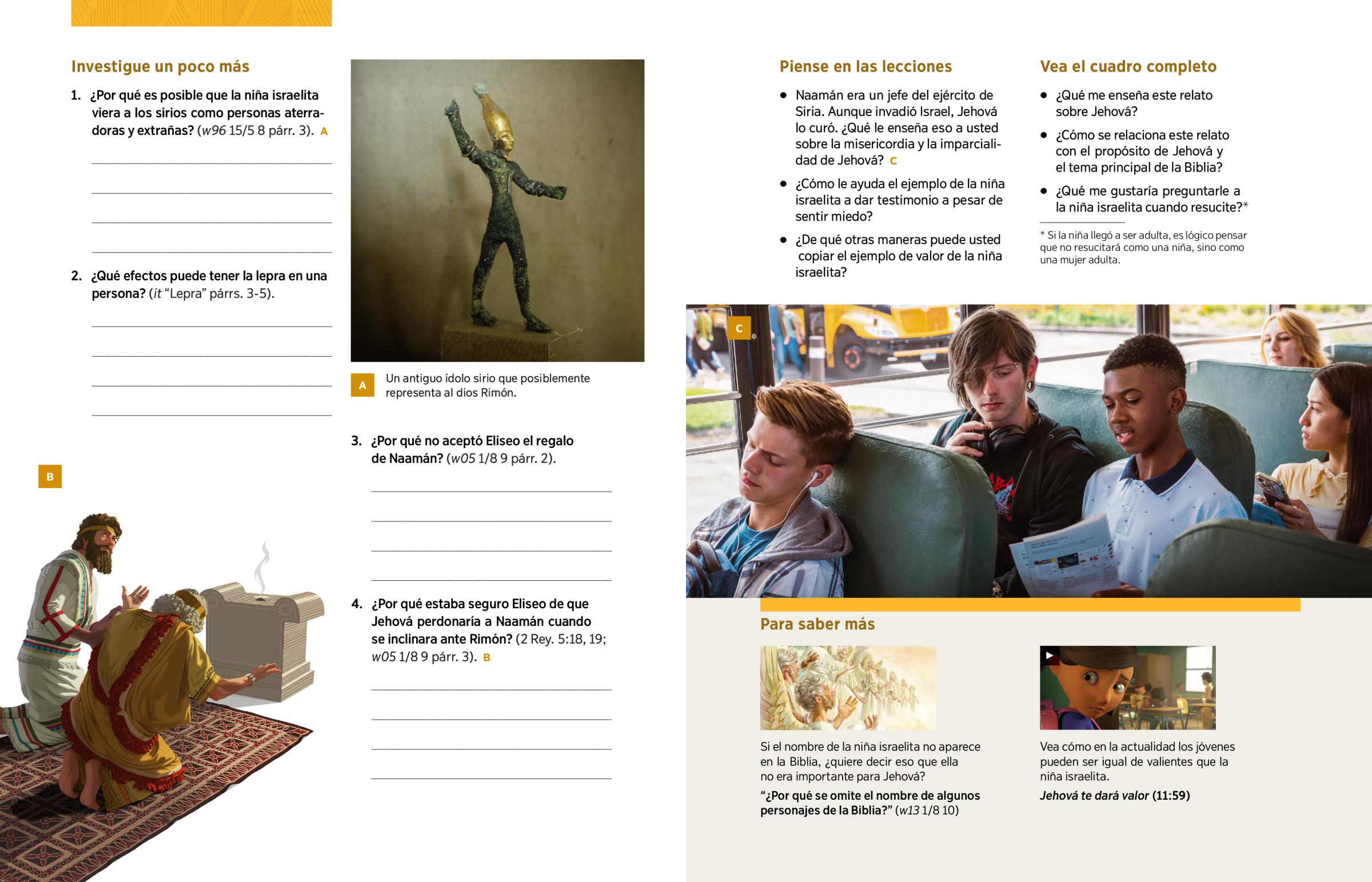 1. 1. ¿Por qué es posible que la niña israelita viera a los sirios como personas aterradoras y extrañas? (w96 15/5 8 párr. 3). A