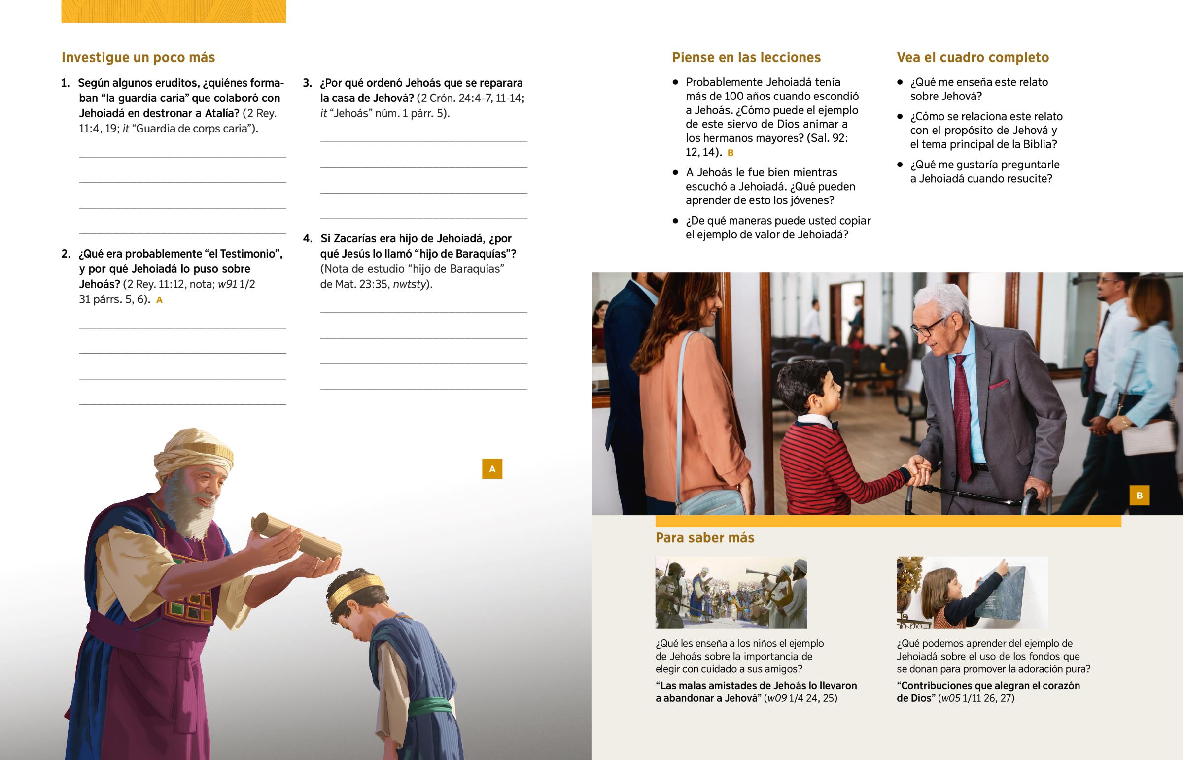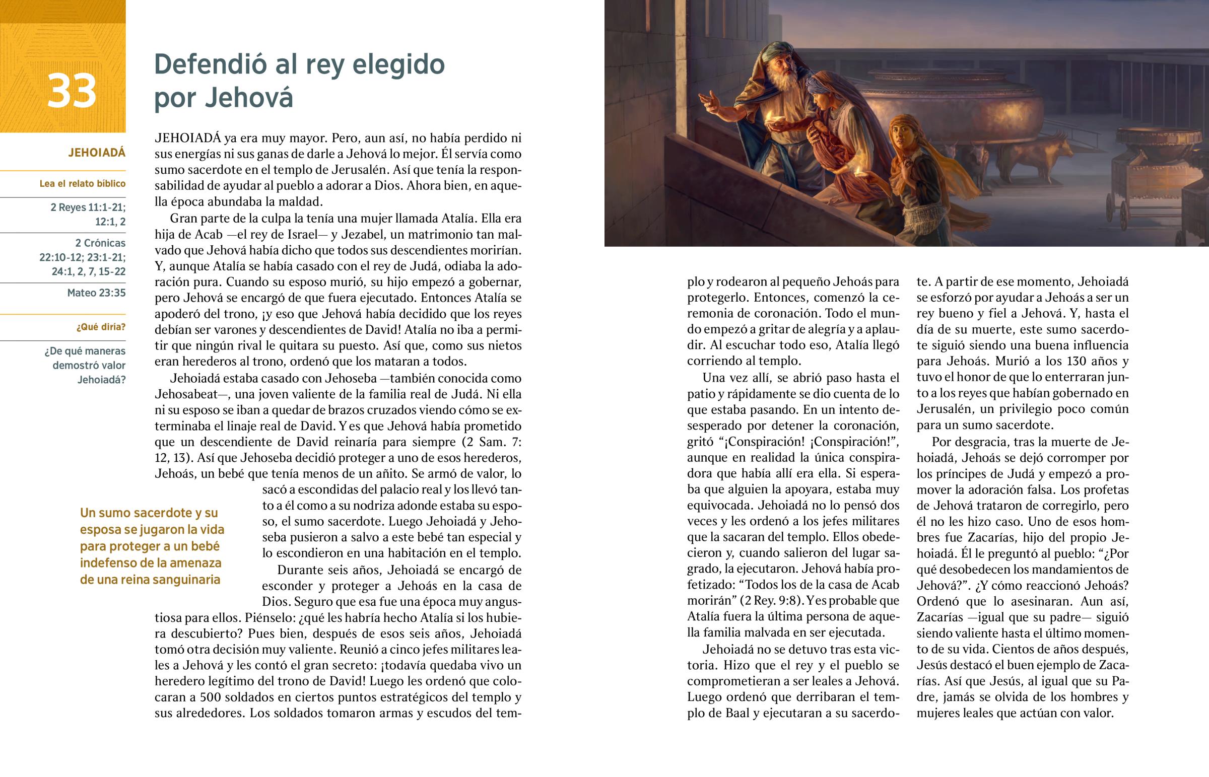 • Probablemente Jehoiadá tenía más de 100 años cuando escondió a Jehoás. ¿Cómo puede el ejemplo de este siervo de Dios animar a los hermanos mayores? (Sal. 92:12, 14). B