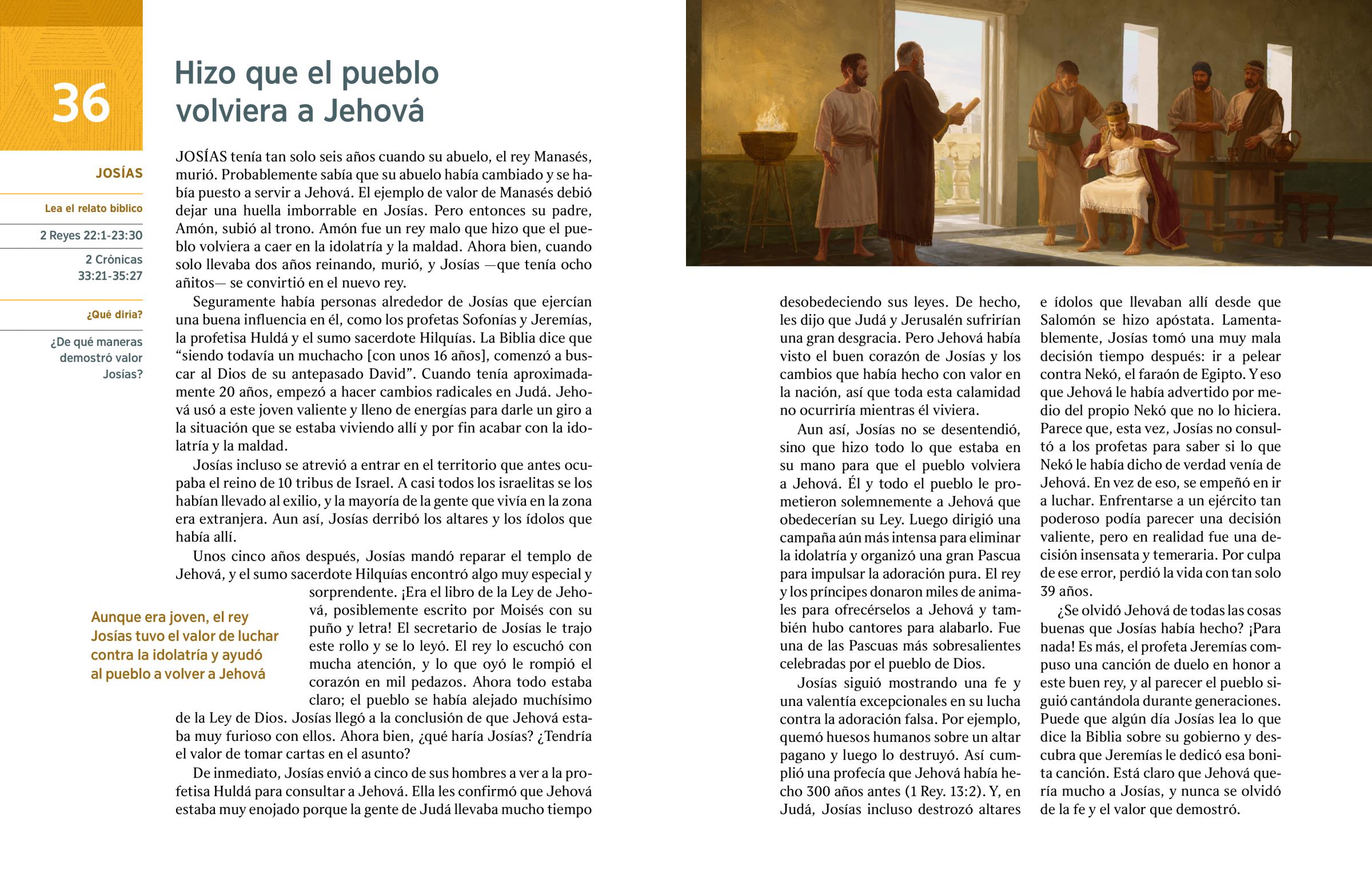 JOSÍAS tenía tan solo seis años cuando su abuelo, el rey Manasés, murió. Probablemente sabía que su abuelo había cambiado y se había puesto a servir a Jehová. El ejemplo de valor de Manasés debió dejar una huella imborrable en Josías. Pero entonces su padre, Amón, subió al trono. Amón fue un rey malo que hizo que el pueblo volviera a caer en la idolatría y la maldad. Ahora bien, cuando solo llevaba dos años reinando, murió, y Josías —que tenía ocho añitos— se convirtió en el nuevo rey.