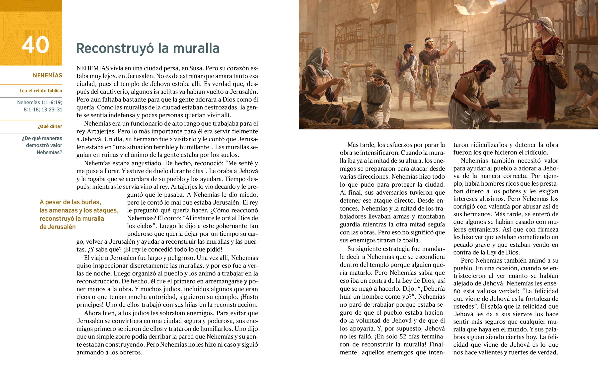 El viaje a Jerusalén fue largo y peligroso. Una vez allí, Nehemías quiso inspeccionar discretamente las murallas, y por eso fue a verlas de noche. Luego organizó al pueblo y los animó a trabajar en la reconstrucción. De hecho, él fue el primero en arremangarse y poner manos a la obra. Y muchos judíos, incluidos algunos que eran ricos o que tenían mucha autoridad, siguieron su ejemplo. ¡Hasta príncipes! Uno de ellos trabajó con sus hijas en la reconstrucción.