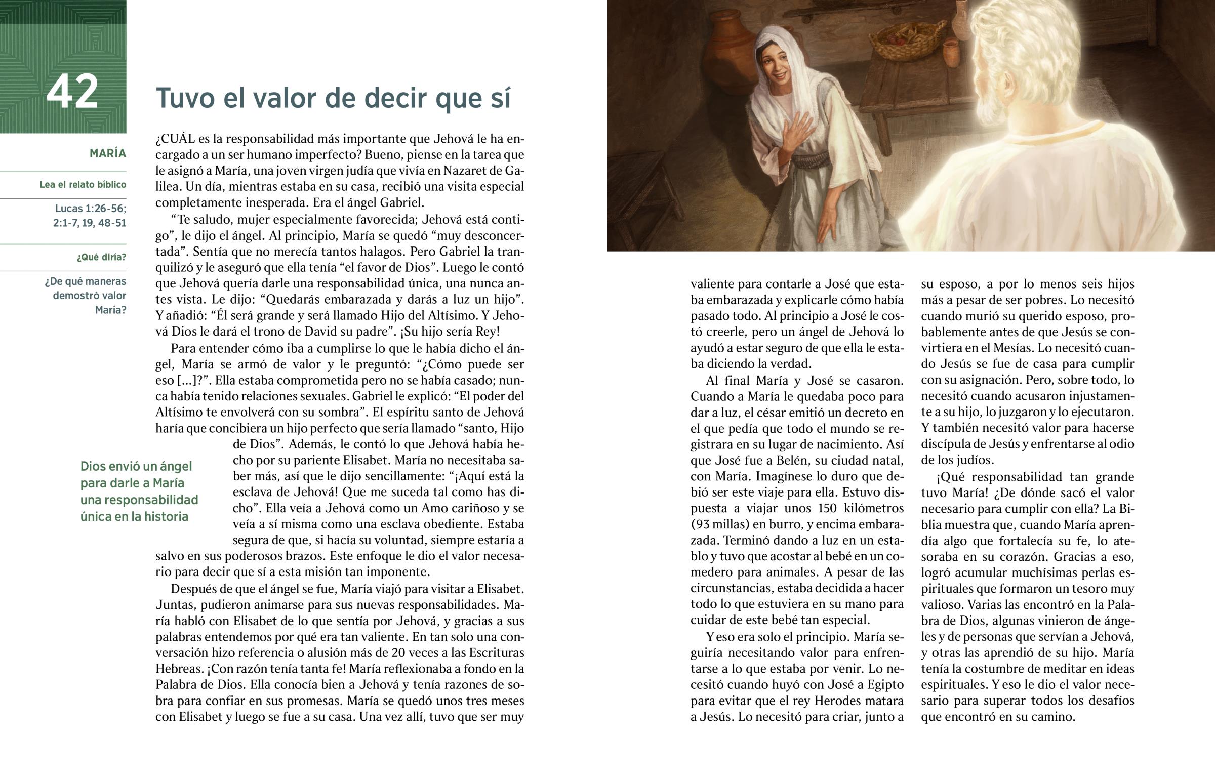 Después de que el ángel se fue, María viajó para visitar a Elisabet. Juntas, pudieron animarse para sus nuevas responsabilidades. María habló con Elisabet de lo que sentía por Jehová, y gracias a sus palabras entendemos por qué era tan valiente. En tan solo una conversación hizo referencia o alusión más de 20 veces a las Escrituras Hebreas. ¡Con razón tenía tanta fe! María reflexionaba a fondo en la Palabra de Dios. Ella conocía bien a Jehová y tenía razones de sobra para confiar en sus promesas. María se quedó unos tres meses con Elisabet y luego se fue a su casa. Una vez allí, tuvo que ser muy valiente para contarle a José que estaba embarazada y explicarle cómo había pasado todo. Al principio a José le costó creerle, pero un ángel de Jehová lo ayudó a estar seguro de que ella le estaba diciendo la verdad.