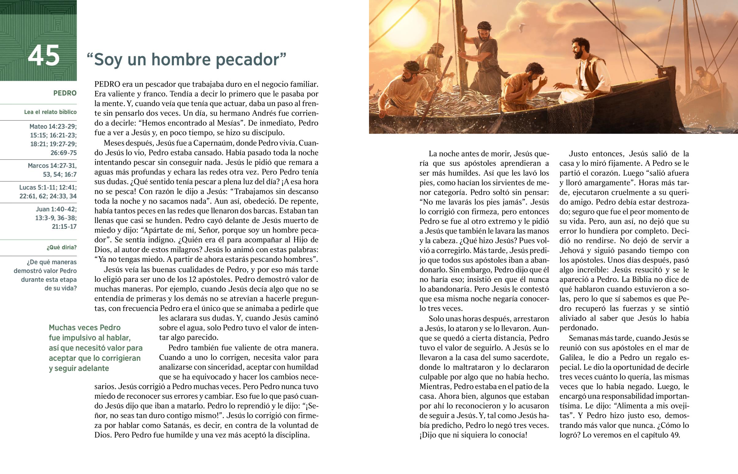 Semanas más tarde, cuando Jesús se reunió con sus apóstoles en el mar de Galilea, le dio a Pedro un regalo especial. Le dio la oportunidad de decirle tres veces cuánto lo quería, las mismas veces que lo había negado. Luego, le encargó una responsabilidad importantísima. Le dijo: “Alimenta a mis ovejitas”. Y Pedro hizo justo eso, demostrando más valor que nunca. ¿Cómo lo logró? Lo veremos en el capítulo 49.