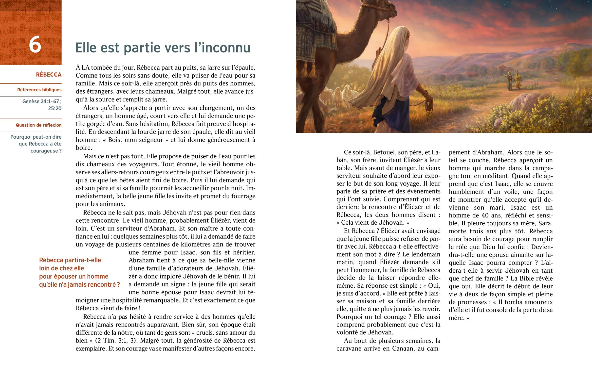 Et Rébecca ? Éliézèr avait envisagé que la jeune fille puisse refuser de partir avec lui. Rébecca a-t-elle effectivement son mot à dire ? Le lendemain matin, quand Éliézèr demande s’il peut l’emmener, la famille de Rébecca décide de la laisser répondre elle-même. Sa réponse est simple : « Oui, je suis d’accord. » Elle est prête à laisser sa maison et sa famille derrière elle, quitte à ne plus jamais les revoir. Pourquoi un tel courage ? Elle aussi comprend probablement que c’est la volonté de Jéhovah.