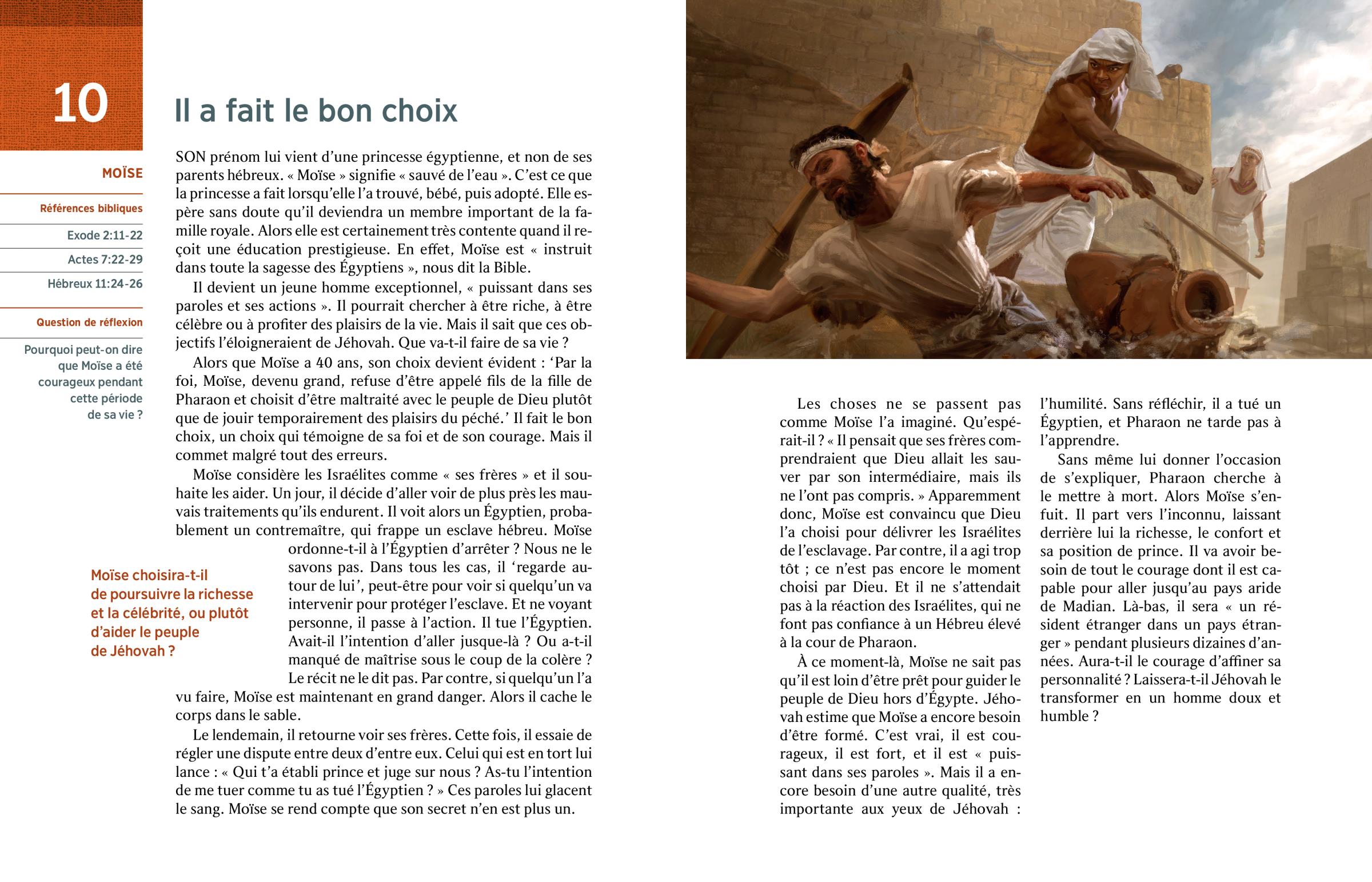 Alors que Moïse a 40 ans, son choix devient évident : ‘Par la foi, Moïse, devenu grand, refuse d’être appelé fils de la fille de Pharaon et choisit d’être maltraité avec le peuple de Dieu plutôt que de jouir temporairement des plaisirs du péché.’ Il fait le bon choix, un choix qui témoigne de sa foi et de son courage. Mais il commet malgré tout des erreurs.