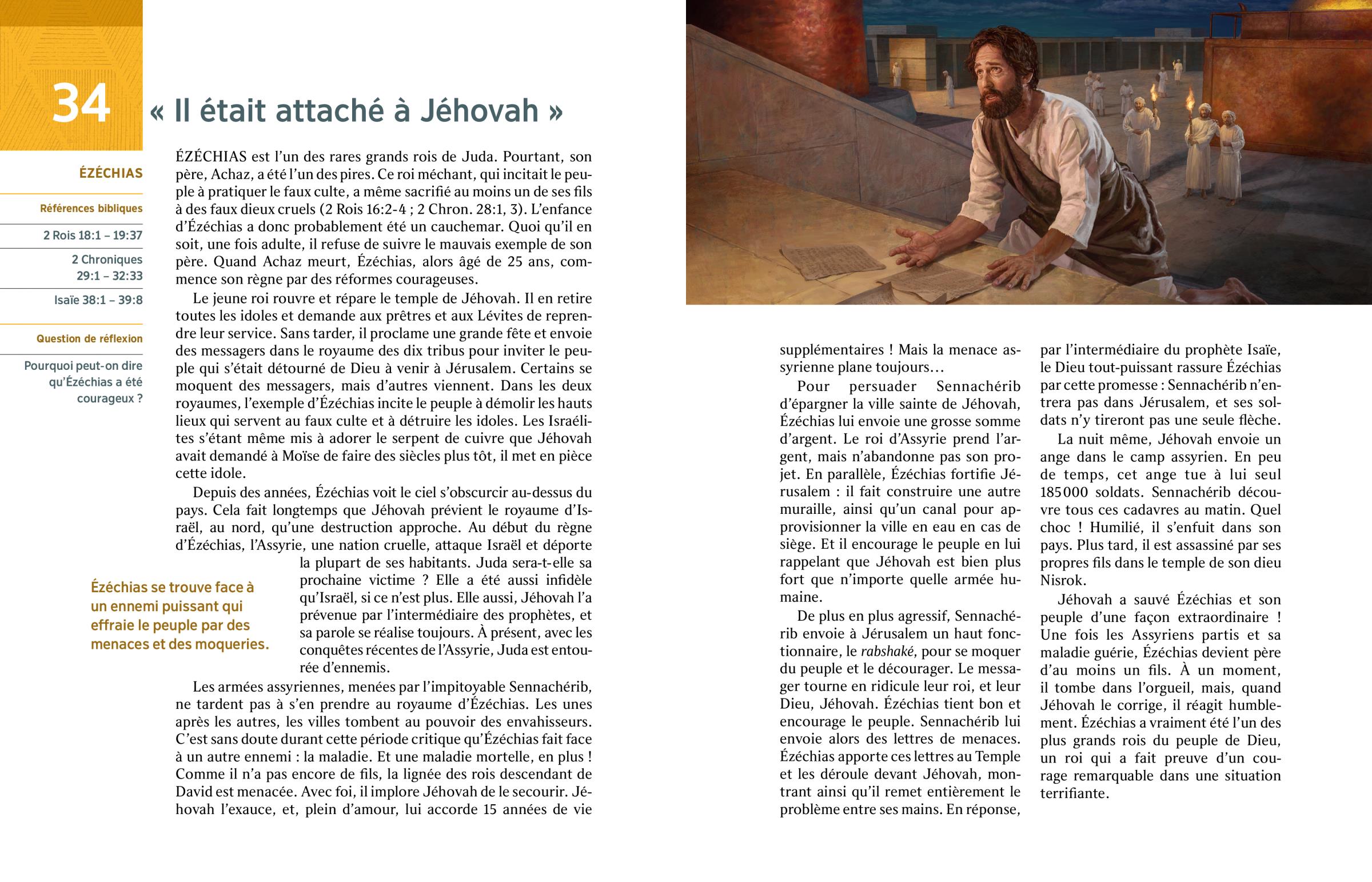 Depuis des années, Ézéchias voit le ciel s’obscurcir au-dessus du pays. Cela fait longtemps que Jéhovah prévient le royaume d’Israël, au nord, qu’une destruction approche. Au début du règne d’Ézéchias, l’Assyrie, une nation cruelle, attaque Israël et déporte la plupart de ses habitants. Juda sera-t-elle sa prochaine victime ? Elle a été aussi infidèle qu’Israël, si ce n’est plus. Elle aussi, Jéhovah l’a prévenue par l’intermédiaire des prophètes, et sa parole se réalise toujours. À présent, avec les conquêtes récentes de l’Assyrie, Juda est entourée d’ennemis.