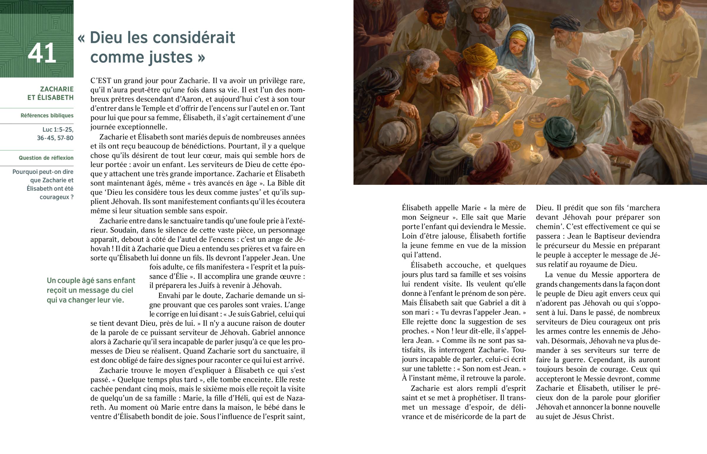 Zacharie entre dans le sanctuaire tandis qu’une foule prie à l’extérieur. Soudain, dans le silence de cette vaste pièce, un personnage apparaît, debout à côté de l’autel de l’encens : c’est un ange de Jéhovah ! Il dit à Zacharie que Dieu a entendu ses prières et va faire en sorte qu’Élisabeth lui donne un fils. Ils devront l’appeler Jean. Une fois adulte, ce fils manifestera « l’esprit et la puissance d’Élie ». Il accomplira une grande œuvre : il préparera les Juifs à revenir à Jéhovah.