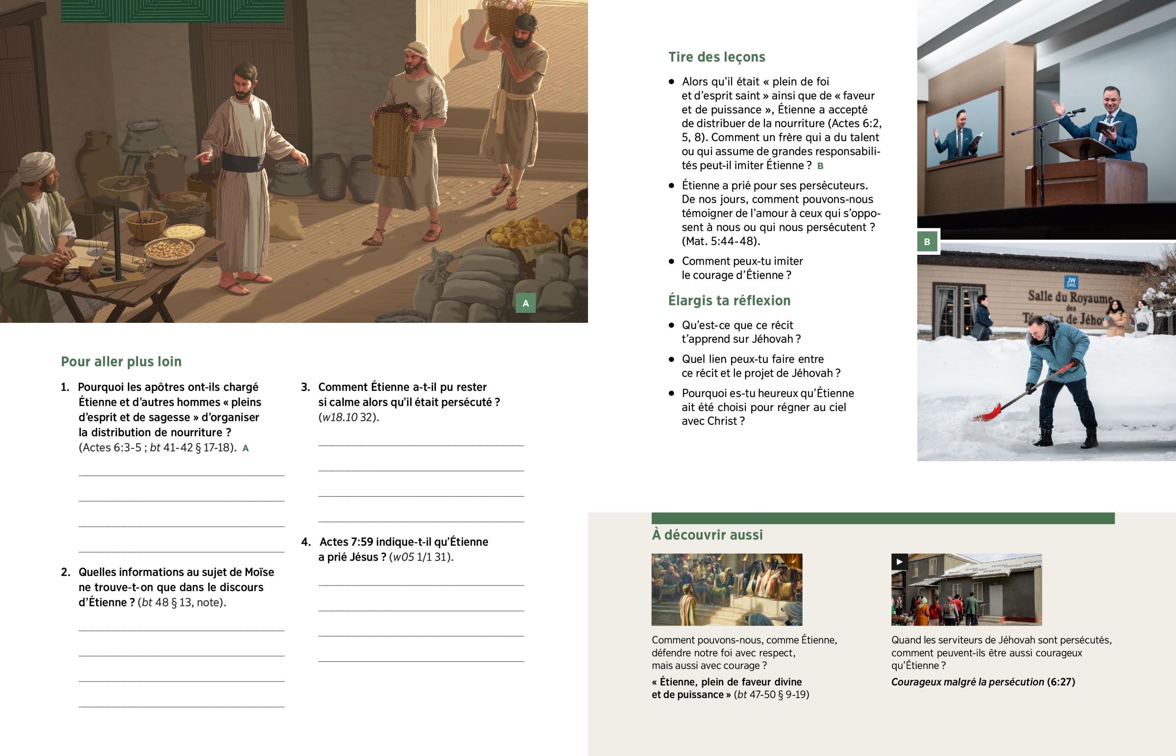 1. Pourquoi les apôtres ont-ils chargé Étienne et d’autres hommes « pleins d’esprit et de sagesse » d’organiser la distribution de nourriture ? (Actes 6:3-5 ; bt 41-42 § 17-18). A