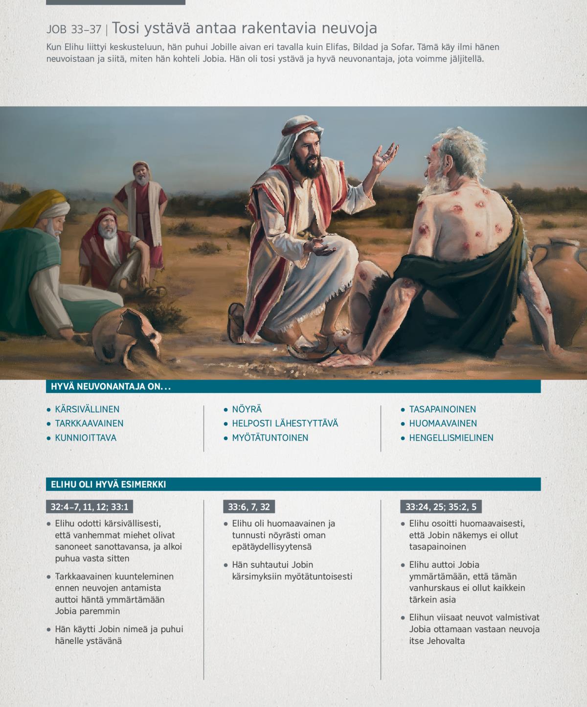 Kun Elihu liittyi keskusteluun, hän puhui Jobille aivan eri tavalla kuin Elifas, Bildad ja Sofar. Tämä käy ilmi hänen neuvoistaan ja siitä, miten hän kohteli Jobia. Hän oli tosi ystävä ja hyvä neuvonantaja, jota voimme jäljitellä.