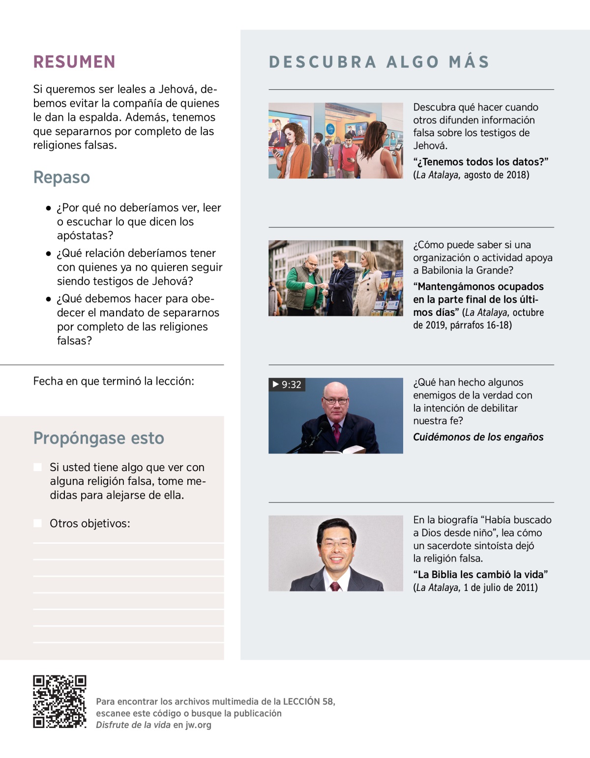 Como amamos a Jehová, no queremos tener nada que ver con las religiones falsas. Ni nuestro trabajo, ni las organizaciones a las que pertenecemos, ni nada de lo que hacemos debería estar relacionado con las religiones falsas. Jehová le da esta advertencia a su pueblo: “Sálganse de ella”, es decir, de Babilonia la Grande (Apocalipsis 18:2, 4).