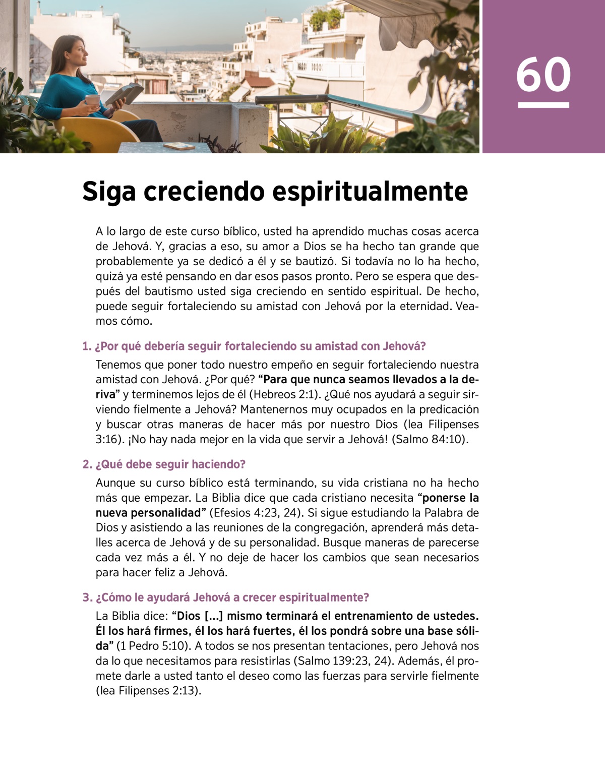 Aunque su curso bíblico está terminando, su vida cristiana no ha hecho más que empezar. La Biblia dice que cada cristiano necesita “ponerse la nueva personalidad” (Efesios 4:23, 24). Si sigue estudiando la Palabra de Dios y asistiendo a las reuniones de la congregación, aprenderá más detalles acerca de Jehová y de su personalidad. Busque maneras de parecerse cada vez más a él. Y no deje de hacer los cambios que sean necesarios para hacer feliz a Jehová.