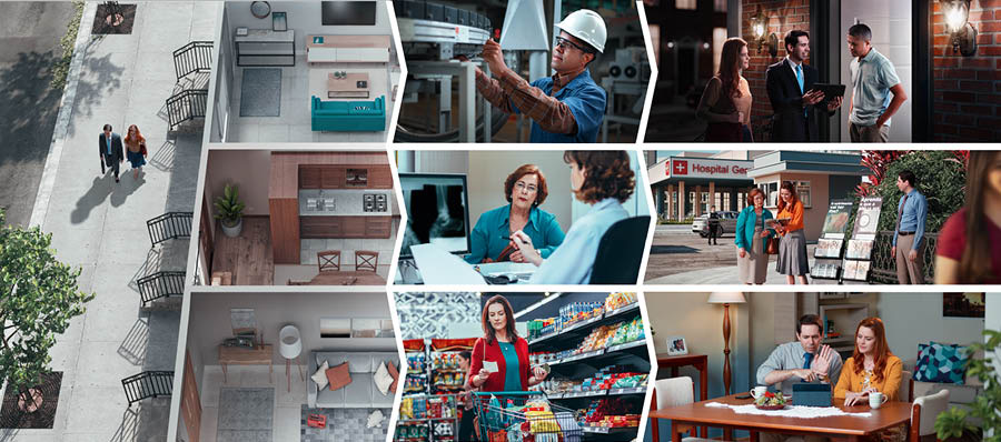 c DESCRIPCIÓN DE LAS IMÁGENES (de arriba abajo): Un matrimonio predica en una zona donde es difícil encontrar a las personas en sus casas. La persona que vive en la primera casa está trabajando, la segunda está en una cita médica en el hospital y la tercera está en el supermercado. El matrimonio consigue hablar con la persona de la primera casa regresando más tarde, encuentra a la segunda predicando con los carritos cerca del hospital y logra hablar con la tercera por teléfono.