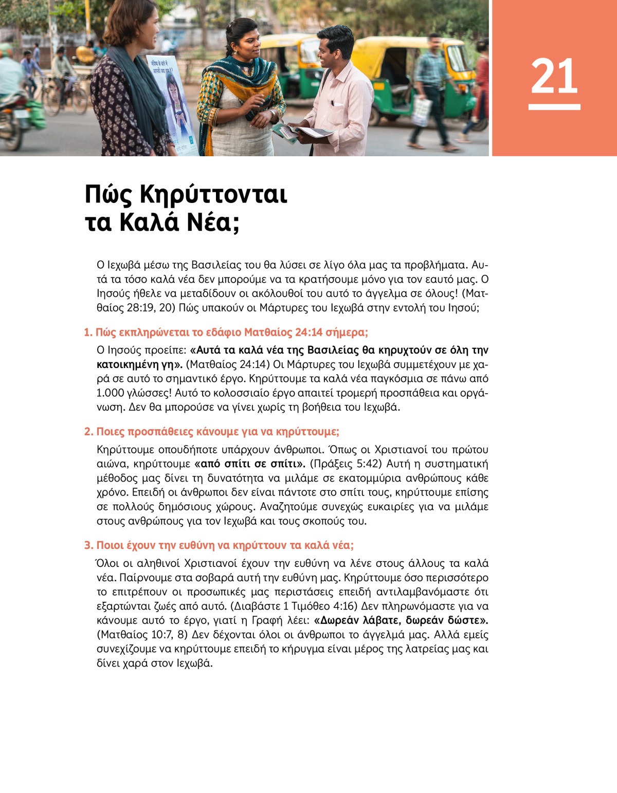 Ο Ιησούς προείπε: «Αυτά τα καλά νέα της Βασιλείας θα κηρυχτούν σε όλη την κατοικημένη γη». (Ματθαίος 24:14) Οι Μάρτυρες του Ιεχωβά συμμετέχουν με χαρά σε αυτό το σημαντικό έργο. Κηρύττουμε τα καλά νέα παγκόσμια σε πάνω από 1.000 γλώσσες! Αυτό το κολοσσιαίο έργο απαιτεί τρομερή προσπάθεια και οργάνωση. Δεν θα μπορούσε να γίνει χωρίς τη βοήθεια του Ιεχωβά.