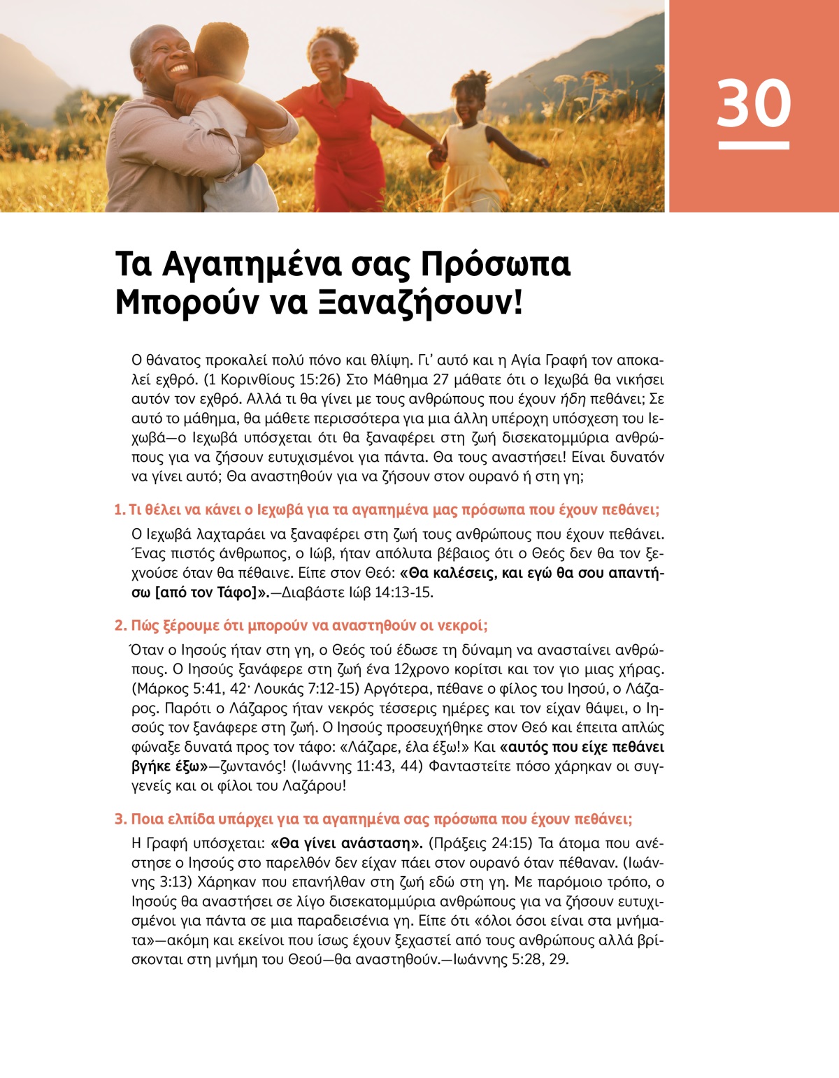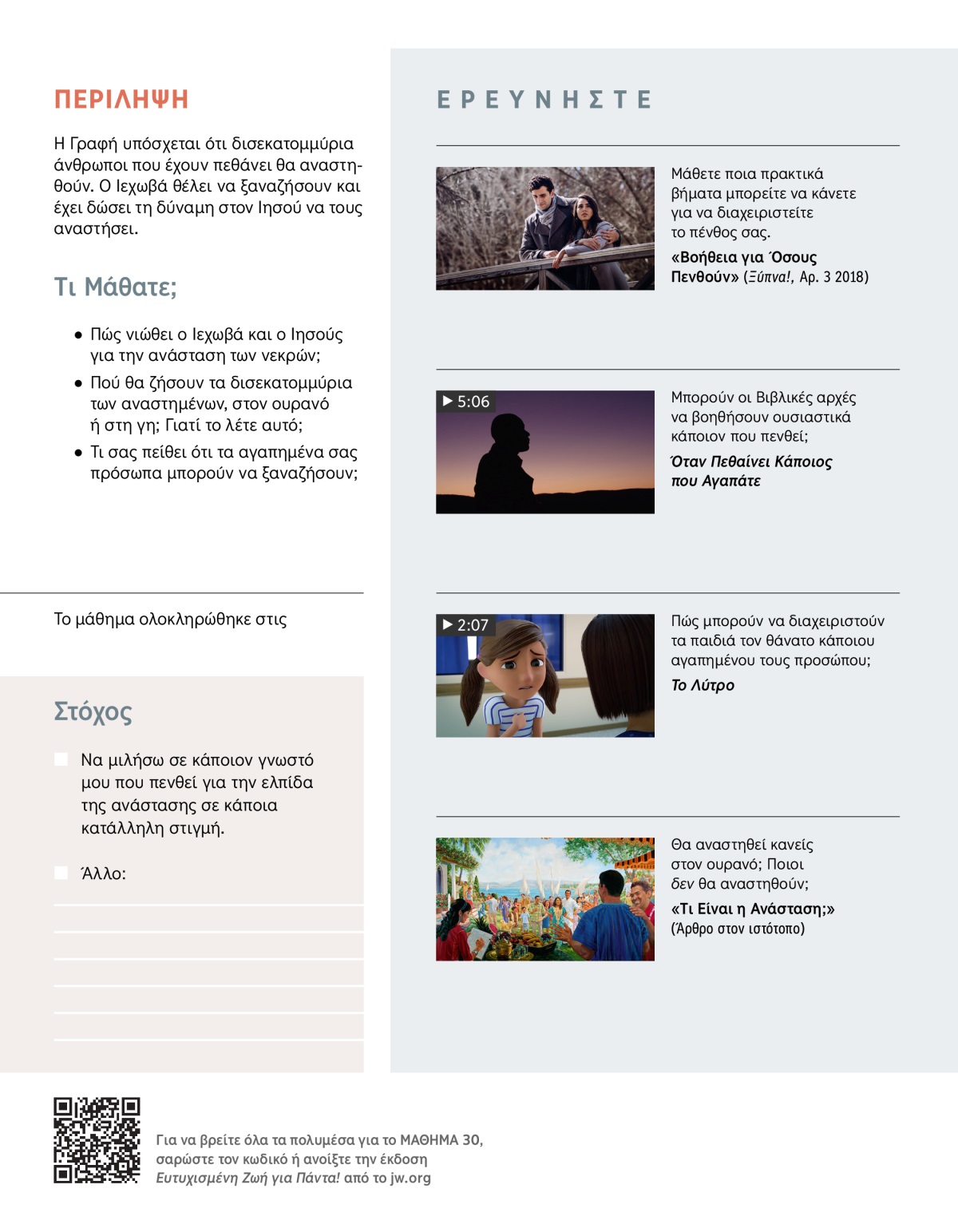 Ο θάνατος προκαλεί πολύ πόνο και θλίψη. Γι’ αυτό και η Αγία Γραφή τον αποκαλεί εχθρό. (1 Κορινθίους 15:26) Στο Μάθημα 27 μάθατε ότι ο Ιεχωβά θα νικήσει αυτόν τον εχθρό. Αλλά τι θα γίνει με τους ανθρώπους που έχουν ήδη πεθάνει; Σε αυτό το μάθημα, θα μάθετε περισσότερα για μια άλλη υπέροχη υπόσχεση του Ιεχωβά—ο Ιεχωβά υπόσχεται ότι θα ξαναφέρει στη ζωή δισεκατομμύρια ανθρώπους για να ζήσουν ευτυχισμένοι για πάντα. Θα τους αναστήσει! Είναι δυνατόν να γίνει αυτό; Θα αναστηθούν για να ζήσουν στον ουρανό ή στη γη;