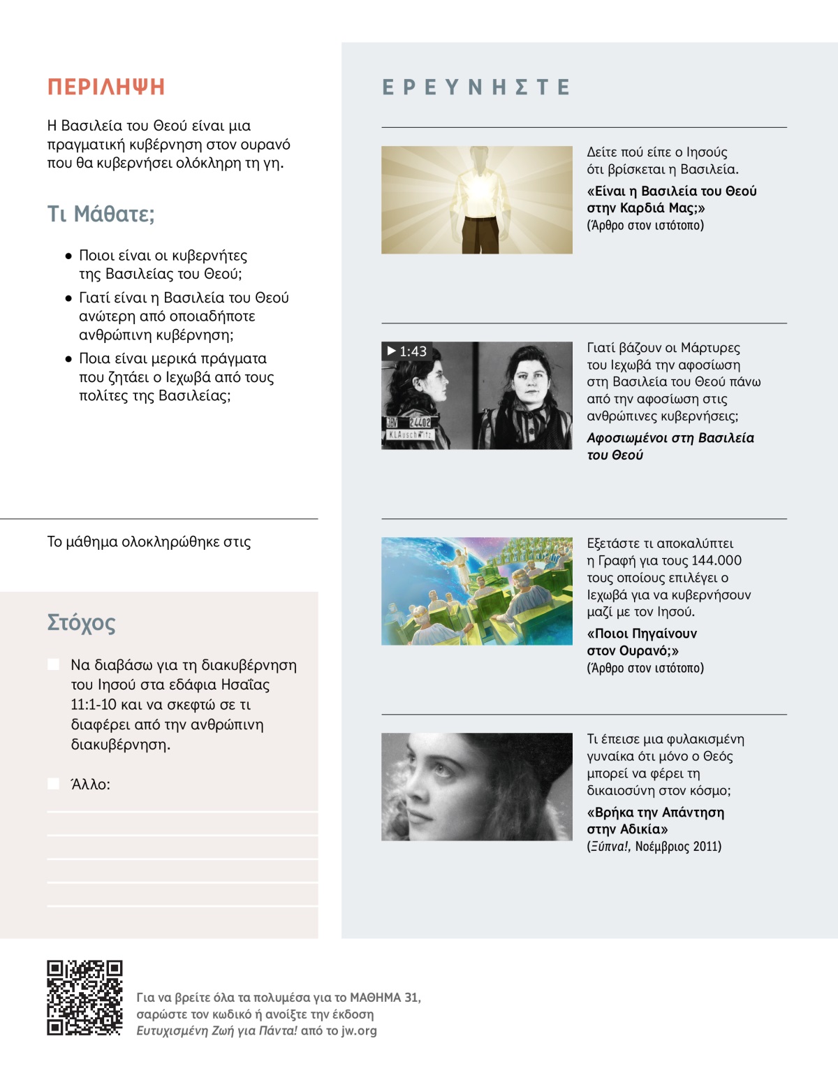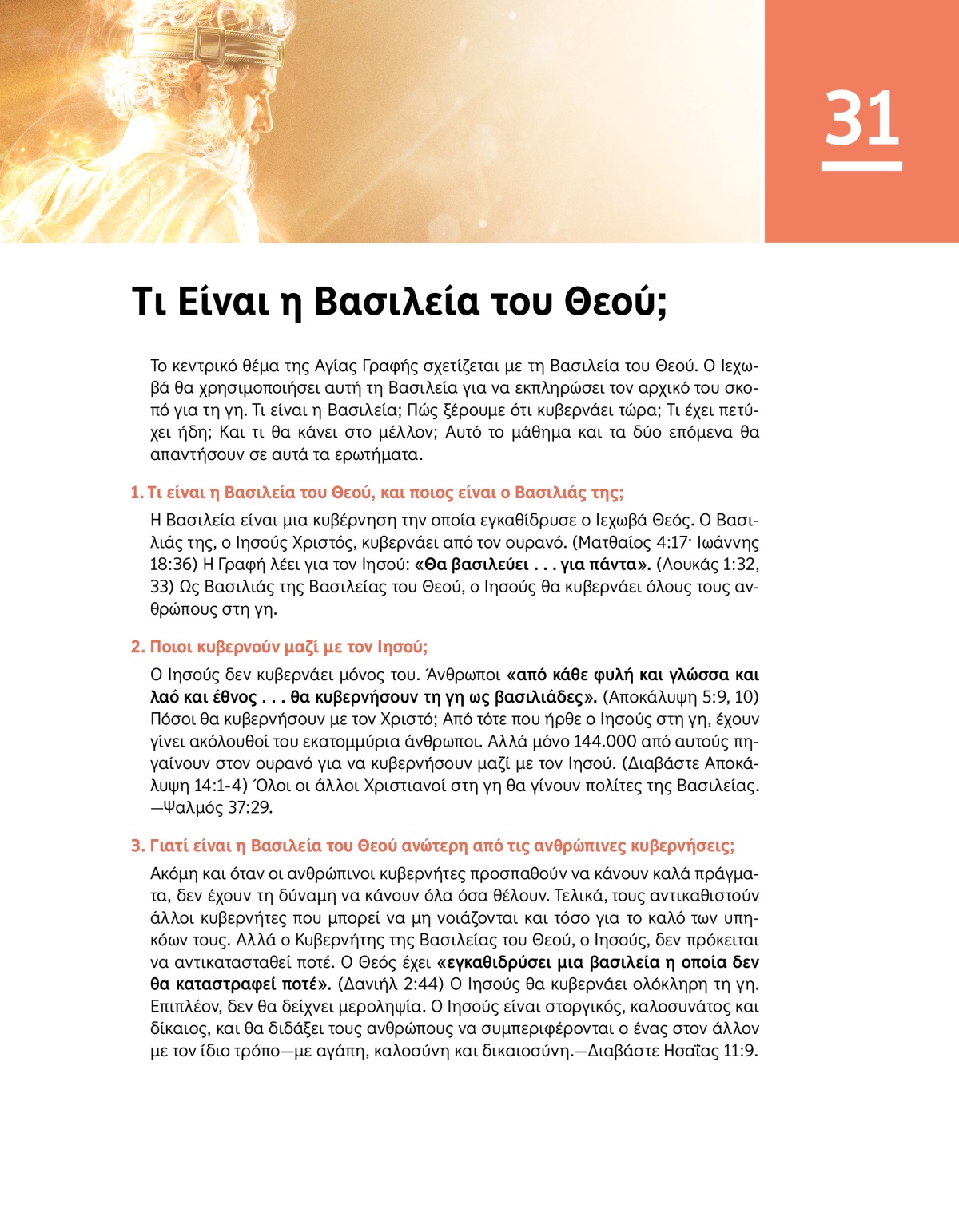 Το κεντρικό θέμα της Αγίας Γραφής σχετίζεται με τη Βασιλεία του Θεού. Ο Ιεχωβά θα χρησιμοποιήσει αυτή τη Βασιλεία για να εκπληρώσει τον αρχικό του σκοπό για τη γη. Τι είναι η Βασιλεία; Πώς ξέρουμε ότι κυβερνάει τώρα; Τι έχει πετύχει ήδη; Και τι θα κάνει στο μέλλον; Αυτό το μάθημα και τα δύο επόμενα θα απαντήσουν σε αυτά τα ερωτήματα.