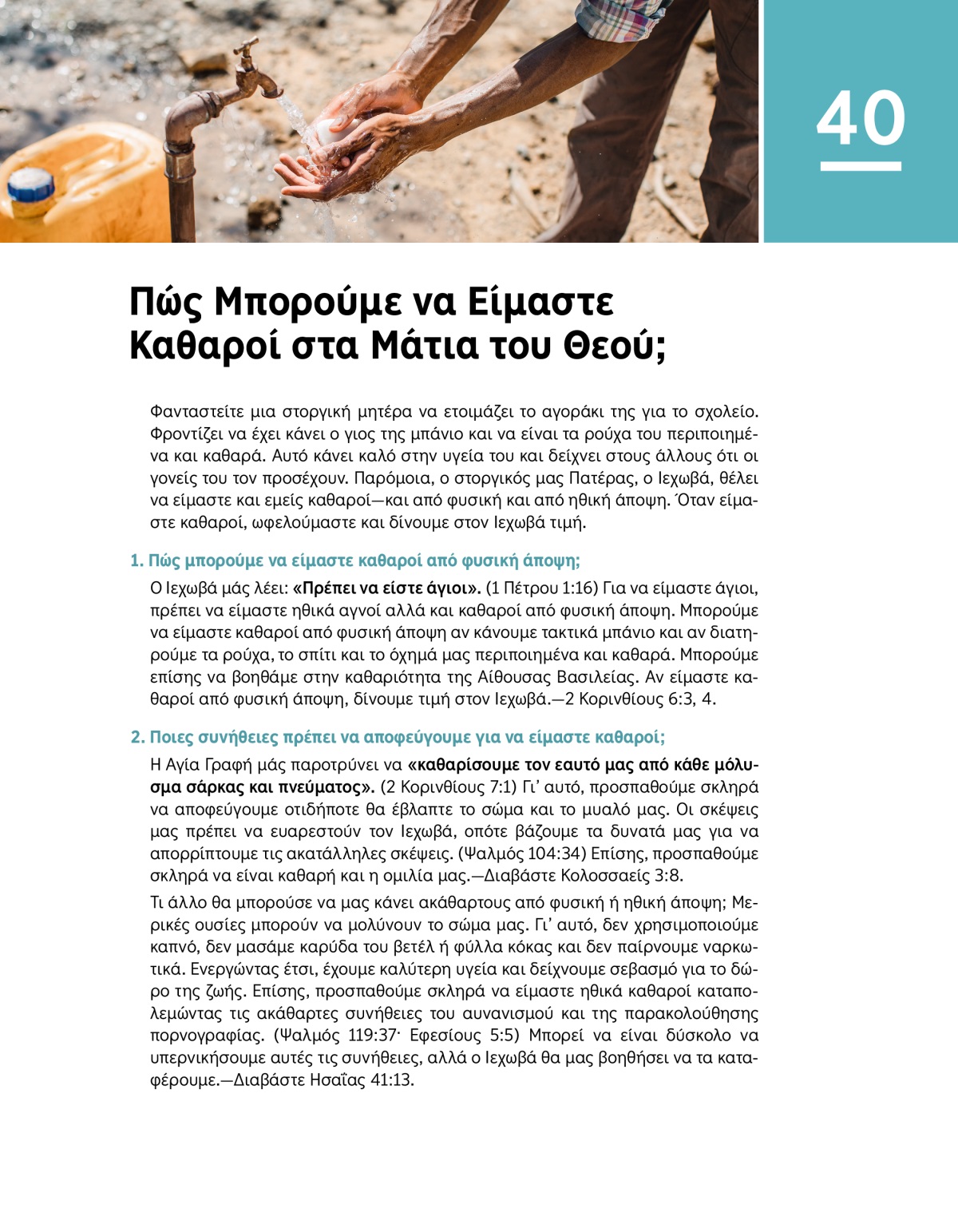 Ο Ιεχωβά μάς λέει: «Πρέπει να είστε άγιοι». (1 Πέτρου 1:16) Για να είμαστε άγιοι, πρέπει να είμαστε ηθικά αγνοί αλλά και καθαροί από φυσική άποψη. Μπορούμε να είμαστε καθαροί από φυσική άποψη αν κάνουμε τακτικά μπάνιο και αν διατηρούμε τα ρούχα, το σπίτι και το όχημά μας περιποιημένα και καθαρά. Μπορούμε επίσης να βοηθάμε στην καθαριότητα της Αίθουσας Βασιλείας. Αν είμαστε καθαροί από φυσική άποψη, δίνουμε τιμή στον Ιεχωβά.—2 Κορινθίους 6:3, 4.