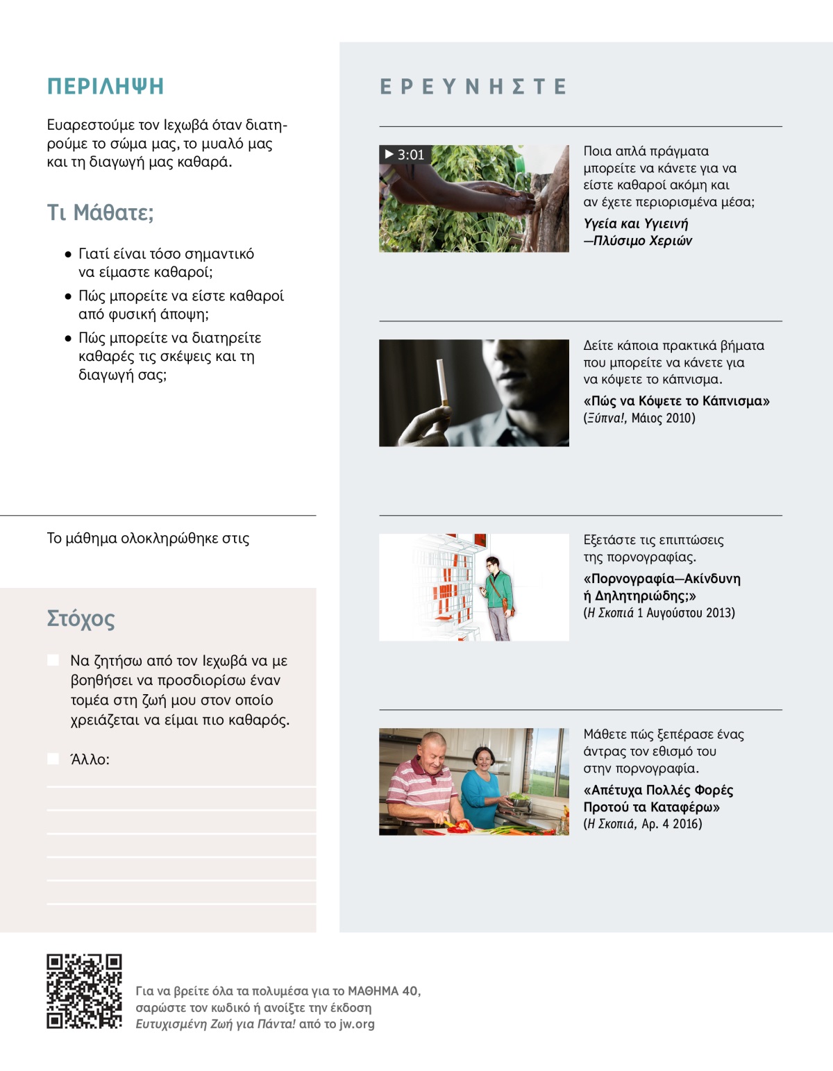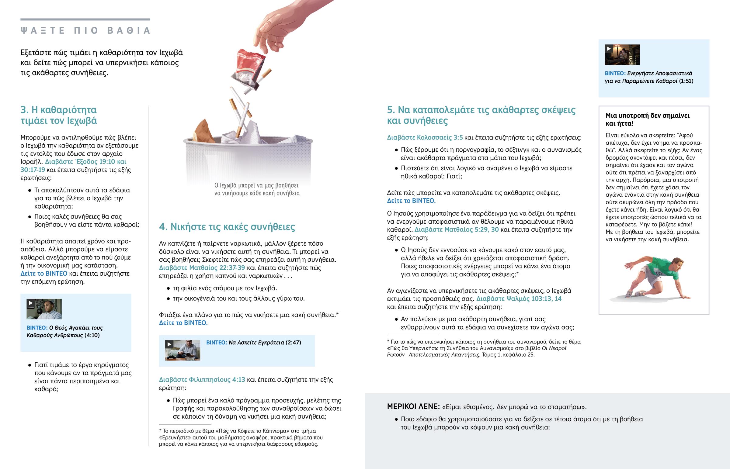 a Το περιοδικό με θέμα «Πώς να Κόψετε το Κάπνισμα» στο τμήμα «Ερευνήστε» αυτού του μαθήματος αναφέρει πρακτικά βήματα που μπορεί να κάνει κάποιος για να υπερνικήσει διάφορους εθισμούς.