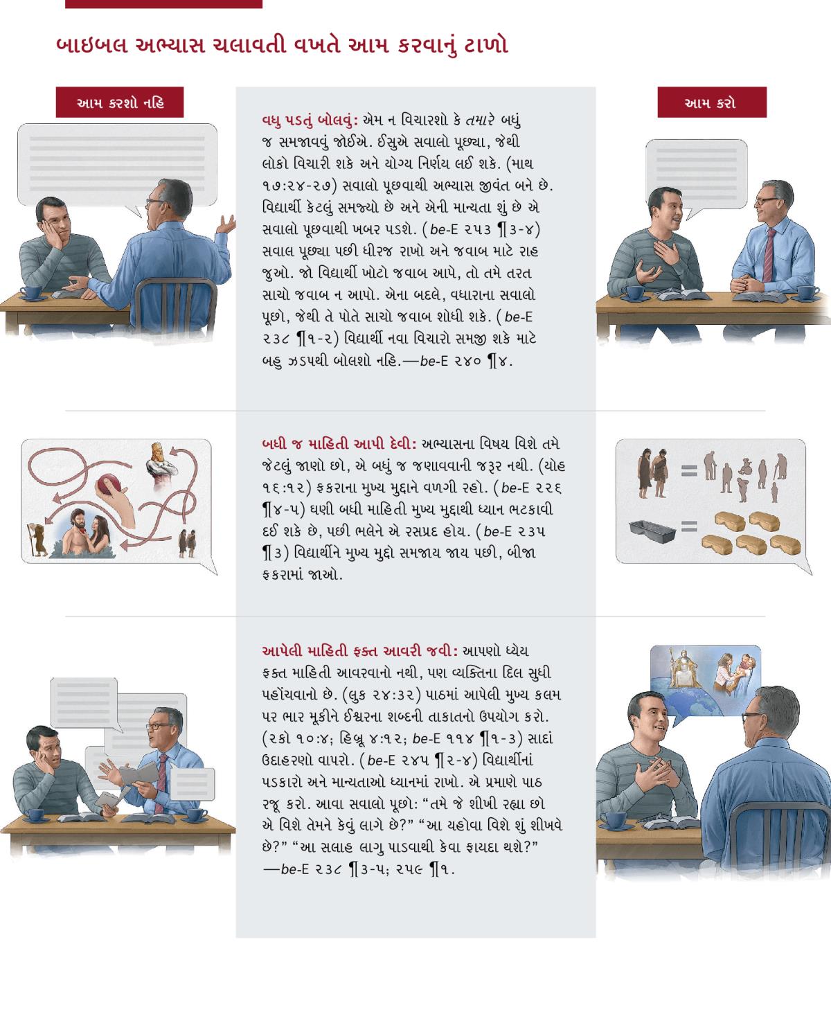 આપેલી માહિતી ફક્ત આવરી જવી: આપણો ધ્યેય ફક્ત માહિતી આવરવાનો નથી, પણ વ્યક્તિના દિલ સુધી પહોંચવાનો છે. (લુક ૨૪:૩૨) પાઠમાં આપેલી મુખ્ય કલમ પર ભાર મૂકીને ઈશ્વરના શબ્દની તાકાતનો ઉપયોગ કરો. (૨કો ૧૦:૪; હિબ્રૂ ૪:૧૨; be-E ૧૧૪ ¶૧-૩) સાદાં ઉદાહરણો વાપરો. (be-E ૨૪૫ ¶૨-૪) વિદ્યાર્થીનાં પડકારો અને માન્યતાઓ ધ્યાનમાં રાખો. એ પ્રમાણે પાઠ રજૂ કરો. આવા સવાલો પૂછો: “તમે જે શીખી રહ્યા છો એ વિશે તેમને કેવું લાગે છે?” “આ યહોવા વિશે શું શીખવે છે?” “આ સલાહ લાગુ પાડવાથી કેવા ફાયદા થશે?”—be-E ૨૩૮ ¶૩-૫; ૨૫૯ ¶૧.