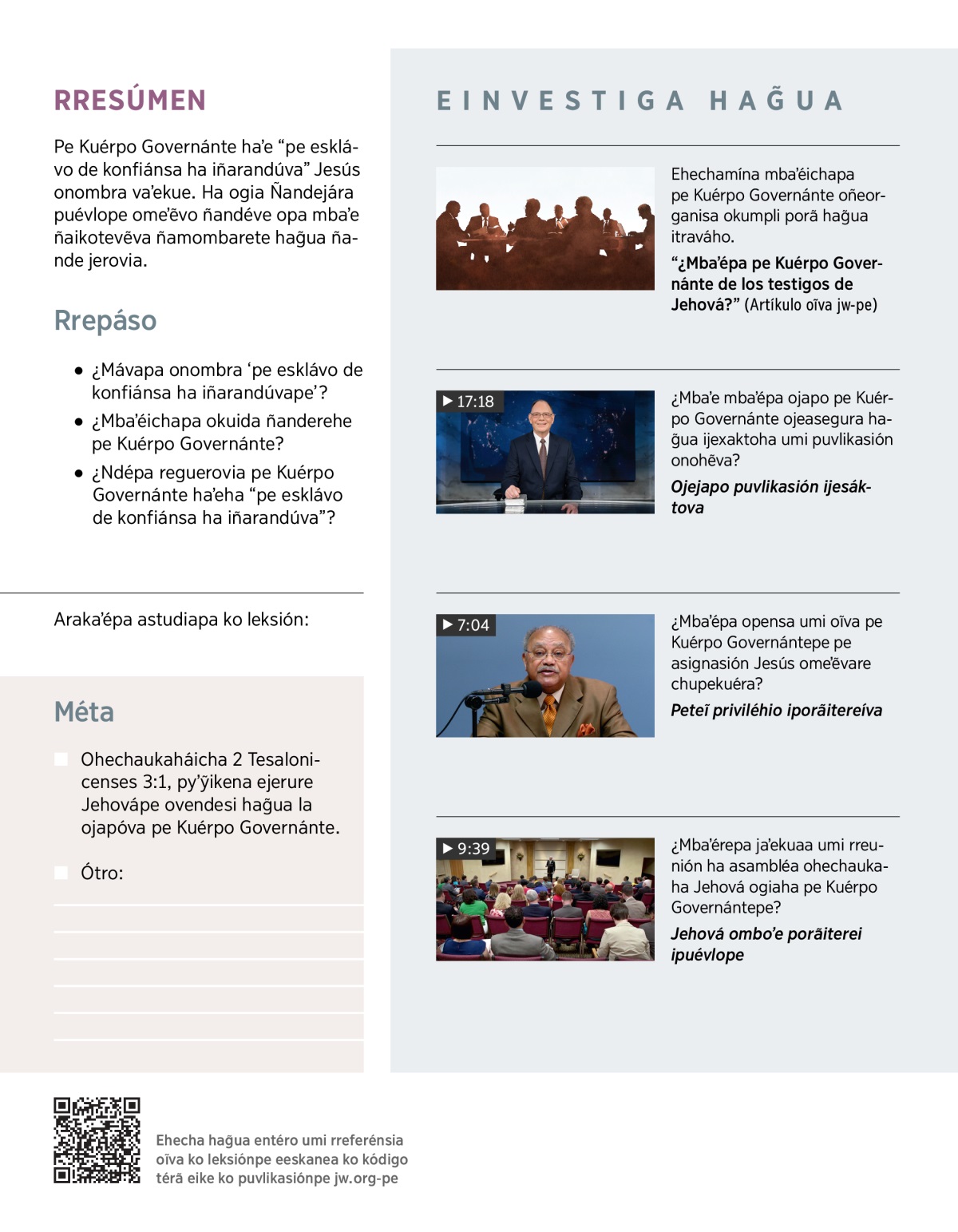 Pe Kuérpo Governánte haʼe “pe esklávo de konfiánsa ha iñarandúva” Jesús onombra vaʼekue. Ha ogia Ñandejára puévlope omeʼẽvo ñandéve opa mbaʼe ñaikotevẽva ñamombarete hag̃ua ñande jerovia.