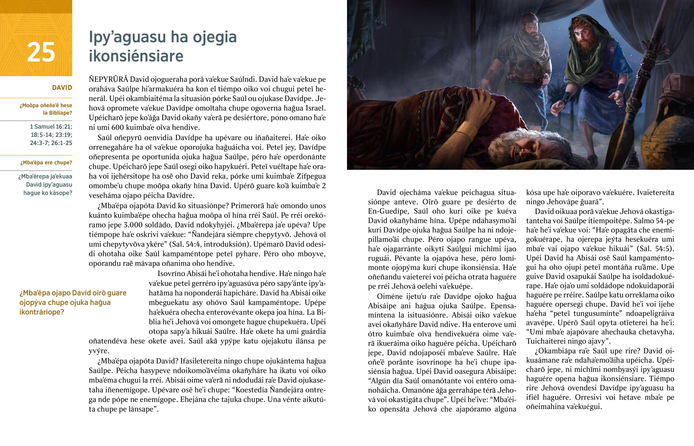 Oiméne ijetuʼu raʼe Davídpe ojoko hag̃ua Abisáipe ani hag̃ua ojuka Saúlpe. Epensamíntena la isituasiónre. Abisái oiko vaʼekue avei okañyháre David ndive. Ha enterove umi ótro kuimbaʼe oĩva hendivekuéra oime vaʼerã ikueráima oiko haguére péicha. Upéicharõ jepe, David ndojaposéi mbaʼeve Saúlre. Haʼe oñeʼẽ porãnte isovrínope ha heʼi chupe ipasiénsia hag̃ua. Upéi David oasegura Abisáipe: “Algún día Saúl omanótante voi entéro omanoháicha. Omanóne ág̃a gerrahápe térã Jehová voi okastigáta chupe”. Upéi heʼive: “Mbaʼéiko opensáta Jehová che ajapóramo algúna kósa upe haʼe oiporavo vaʼekuére. Ivaietereíta ningo Jehovápe g̃uarã”.