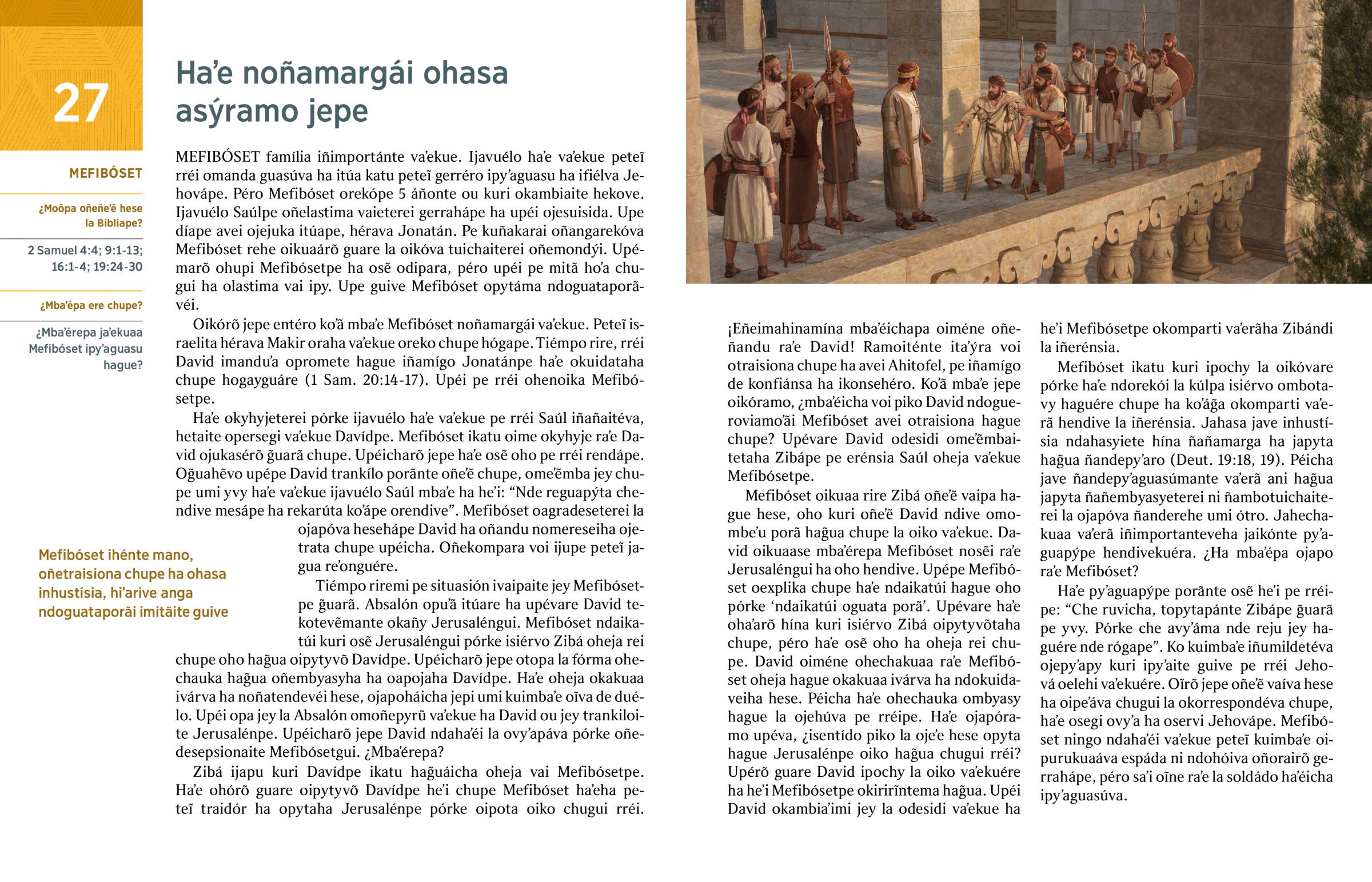 Haʼe pyʼaguapýpe porãnte osẽ heʼi pe rréipe: “Che ruvicha, topytapánte Zibápe g̃uarã pe yvy. Pórke che avyʼáma nde reju jey haguére nde rógape”. Ko kuimbaʼe iñumildetéva ojepyʼapy kuri ipyʼaite guive pe rréi Jehová oelehi vaʼekuére. Oĩrõ jepe oñeʼẽ vaíva hese ha oipeʼáva chugui la okorrespondéva chupe, haʼe osegi ovyʼa ha oservi Jehovápe. Mefibóset ningo ndahaʼéi vaʼekue peteĩ kuimbaʼe oipurukuaáva espáda ni ndohóiva oñorairõ gerrahápe, péro saʼi oĩne raʼe la soldádo haʼéicha ipyʼaguasúva.