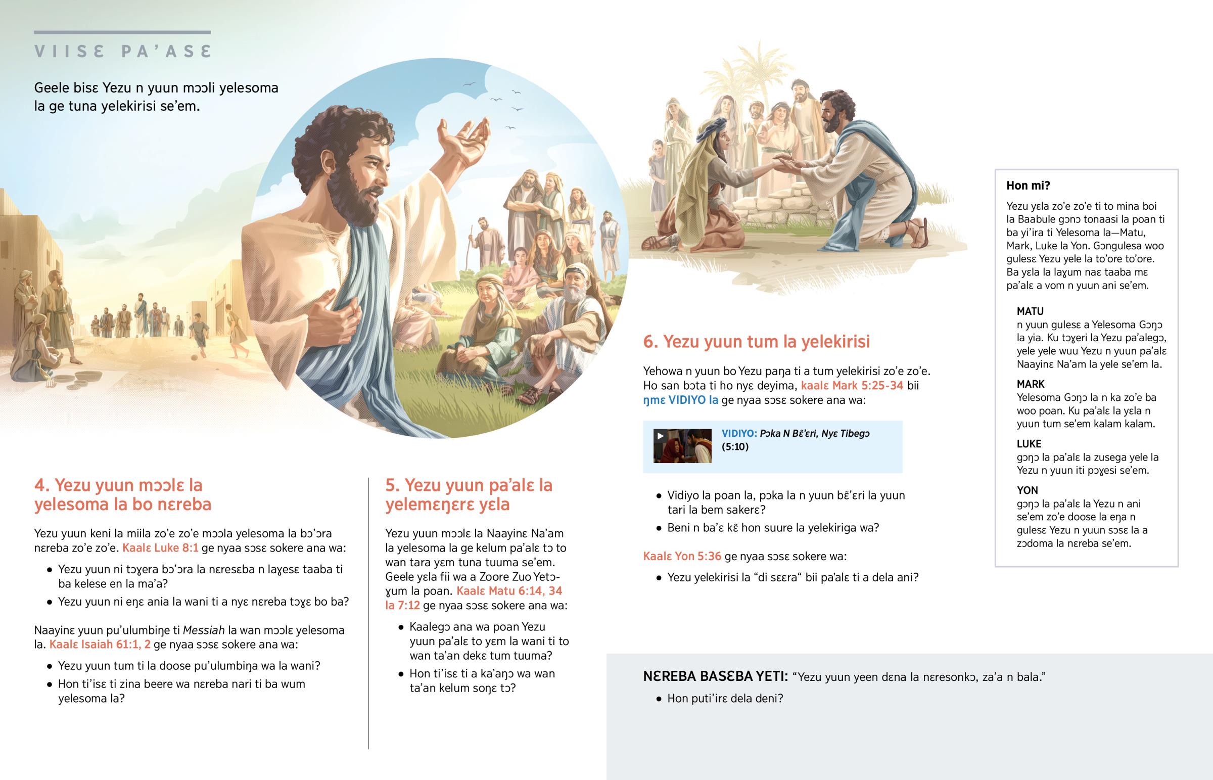 Yezu yɛla zo’e zo’e ti to mina boi la Baabule gɔnɔ tonaasi la poan ti ba yi’ira ti Yelesoma la—Matu, Mark, Luke la Yon. Gɔngulesa woo gulesɛ Yezu yele la to’ore to’ore. Ba yɛla la laɣum naɛ taaba mɛ pa’alɛ a vom n yuun ani se’em.