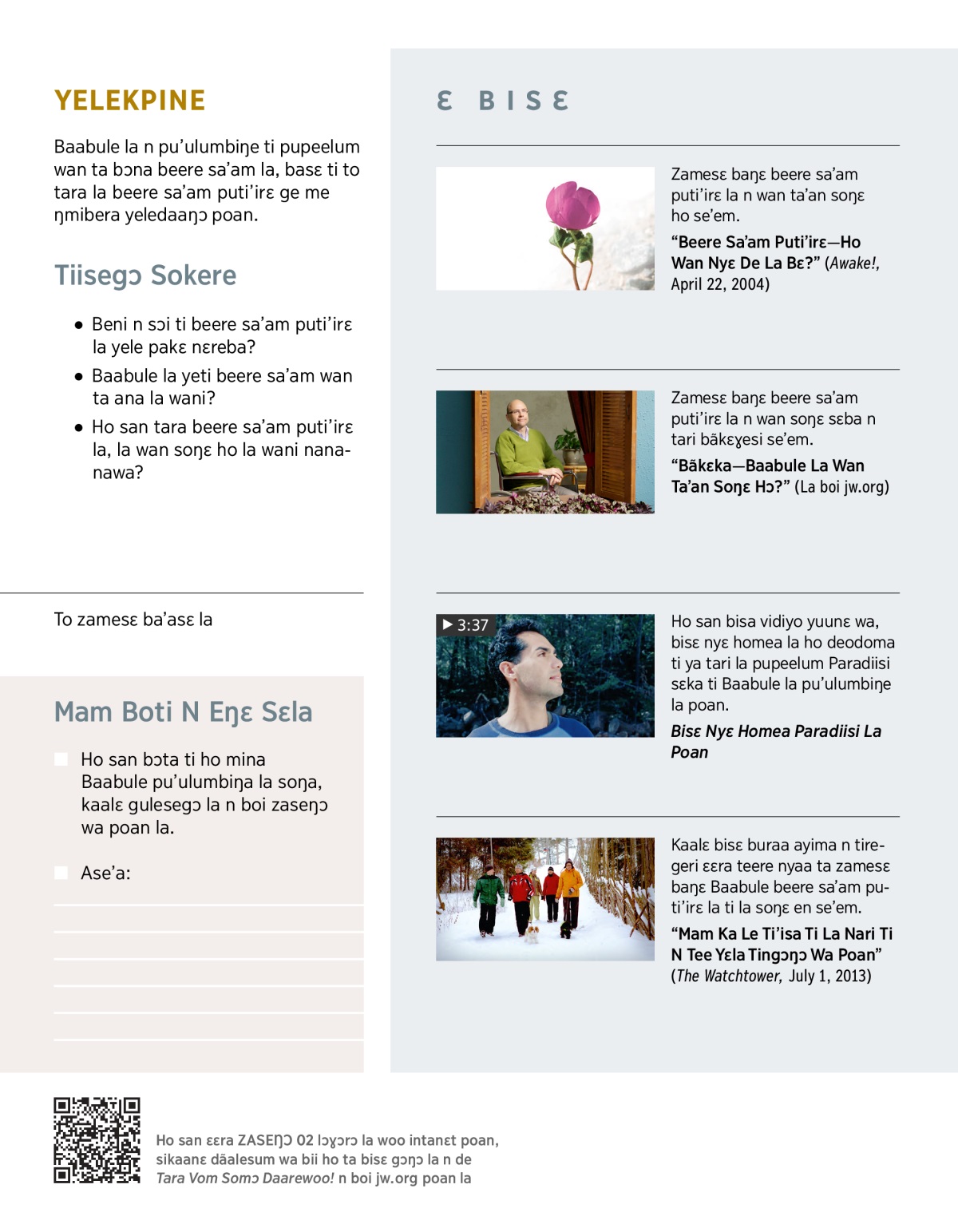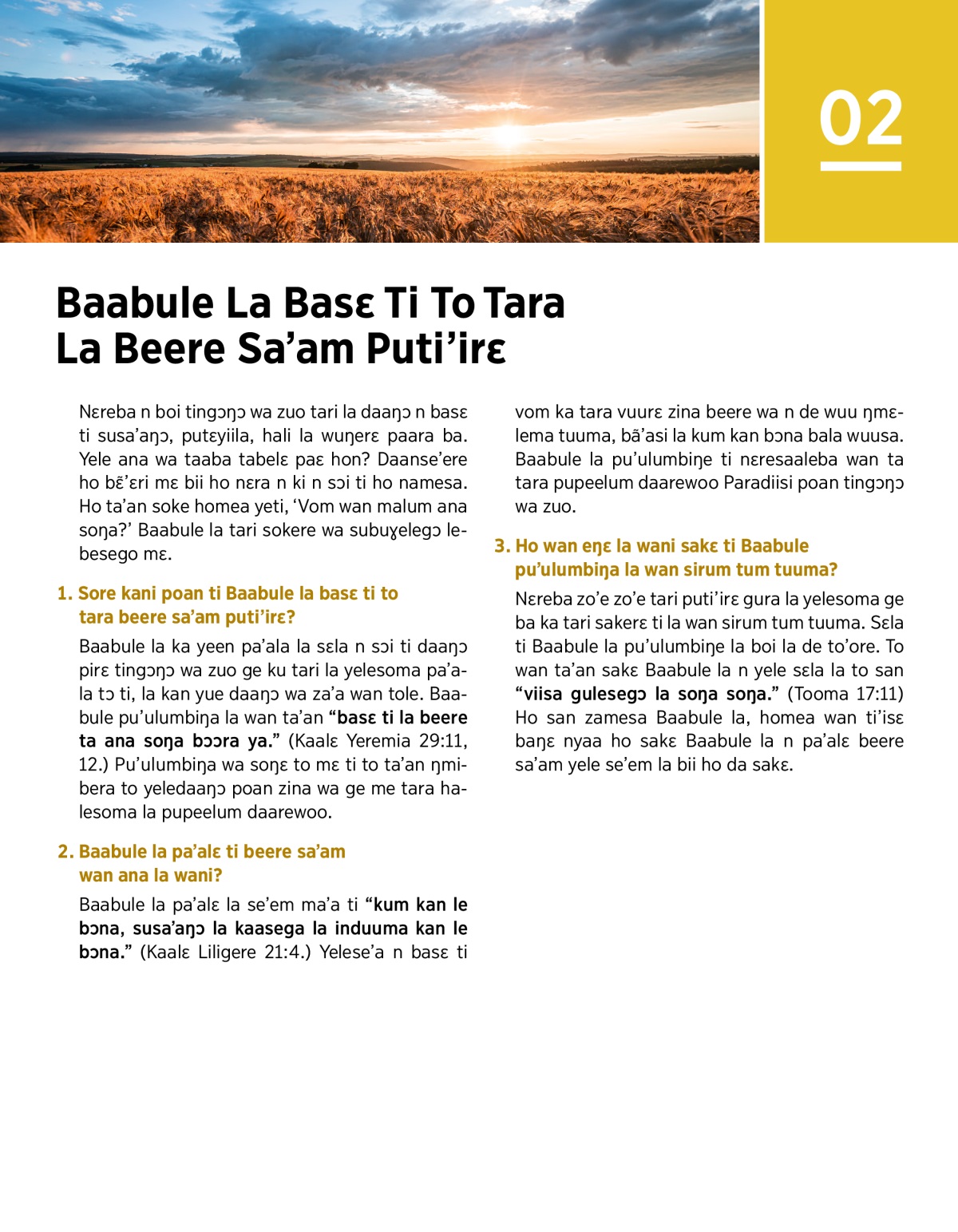 Baabule la ka yeen pa’ala la sɛla n sɔi ti daaŋɔ pirɛ tingɔŋɔ wa zuo ge ku tari la yelesoma pa’ala tɔ ti, la kan yue daaŋɔ wa za’a wan tole. Baabule pu’ulumbiŋa la wan ta’an “basɛ ti la beere ta ana soŋa bɔɔra ya.” (Kaalɛ Yeremia 29:11, 12.) Pu’ulumbiŋa wa soŋɛ to mɛ ti to ta’an ŋmibera to yeledaaŋɔ poan zina wa ge me tara halesoma la pupeelum daarewoo.