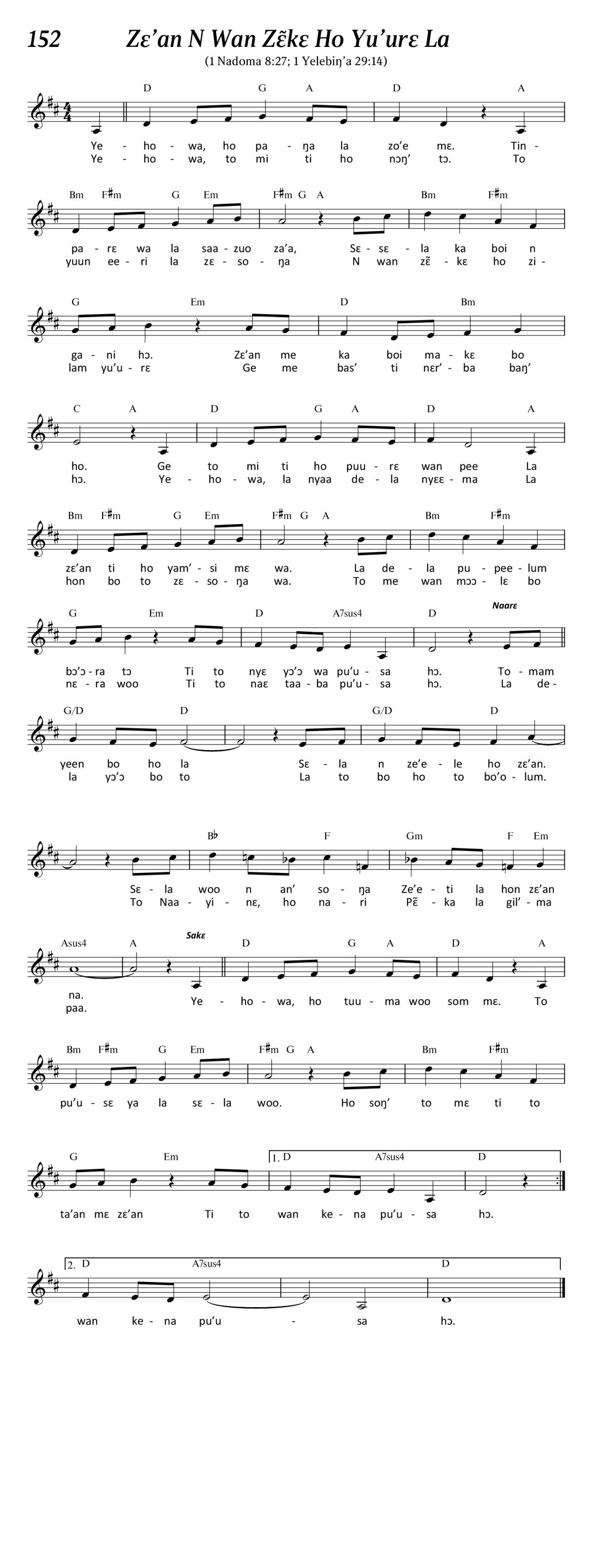 - 2. Ye-ho-wa, to mi ti ho nɔŋ’ tɔ. - To yuun ee-ri la zɛ-so-ŋa - N wan zɛ̃-kɛ ho zi-lam yu’u-rɛ - Ge me bas’ ti nɛr’-ba baŋ’ hɔ. - Ye-ho-wa, la nyaa de-la nyɛɛ-ma - La hon bo to zɛ-so-ŋa wa. - To me wan mɔɔ-lɛ bo nɛ-ra woo - Ti to naɛ taa-ba pu’u-sa hɔ. - (NAARƐ) - La de-la yɔ’ɔ bo to - La to bo ho to bo’o-lum. - To Naa-yi-nɛ, ho na-ri - Pɛ̃-ka la gil’-ma paa. - (SAKƐ) - Ye-ho-wa, ho tuu-ma woo som mɛ. - To pu’u-sɛ ya la sɛ-la woo. - Ho soŋ’ to mɛ ti to ta’an mɛ zɛ’an - Ti to wan ke-na pu’u-sa hɔ.